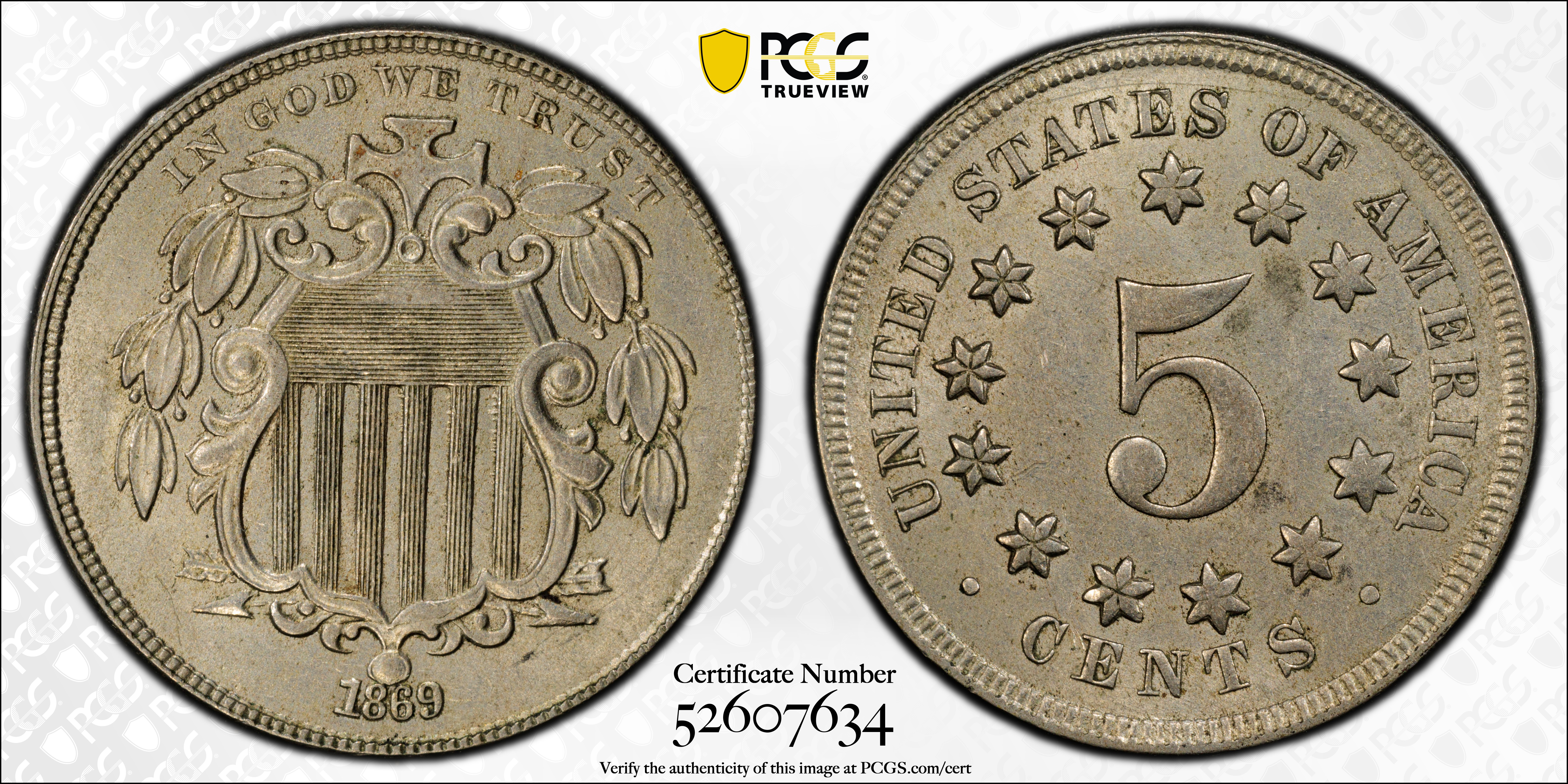 1869 5C AU58 认证号52607634, PCGS号3796