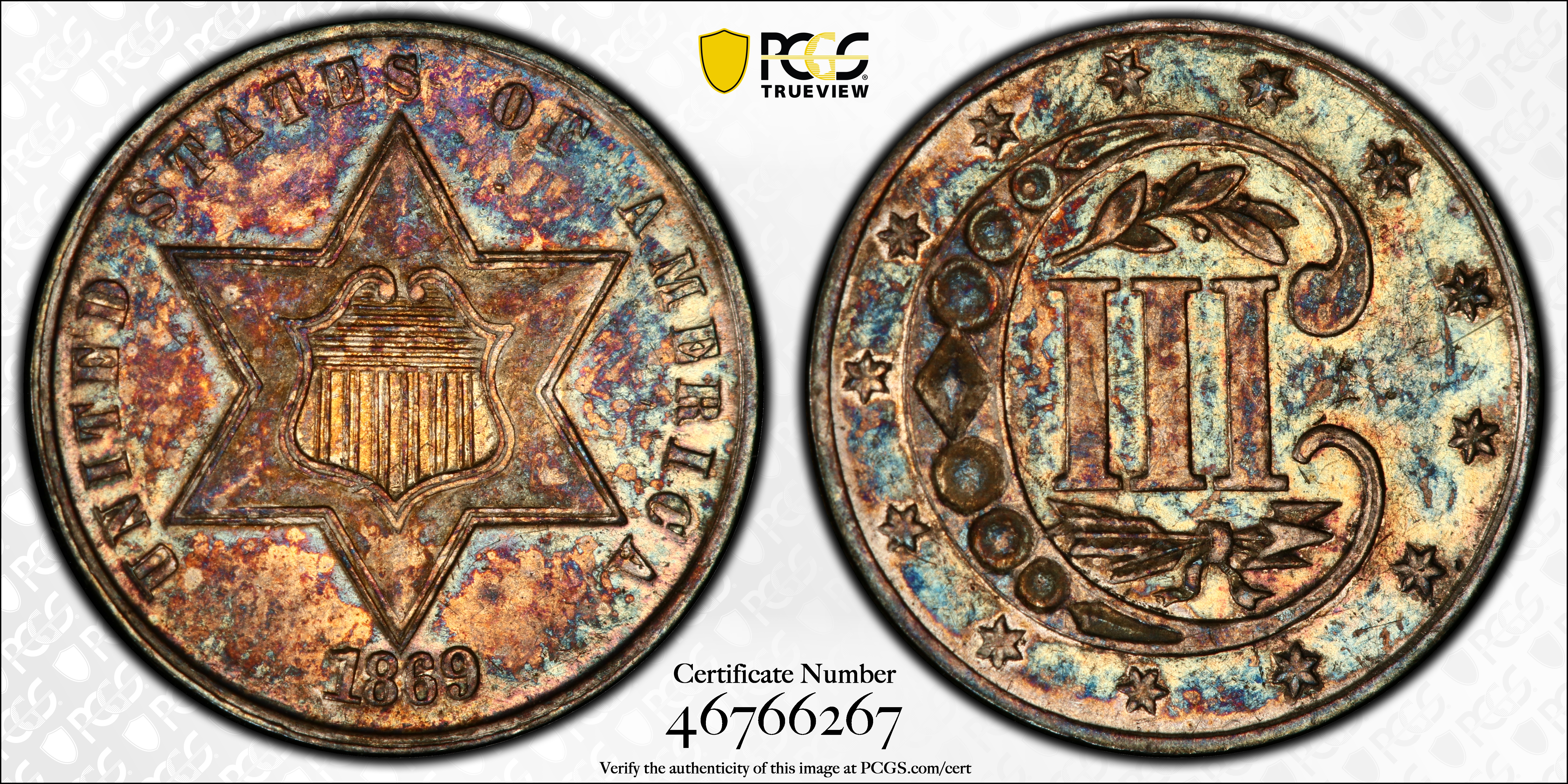 The typical 1869 Three Cent Silver is usually well struck and will come either frosty or Prooflike. The finest examples certified by PCGS include four MS66s and none finer.