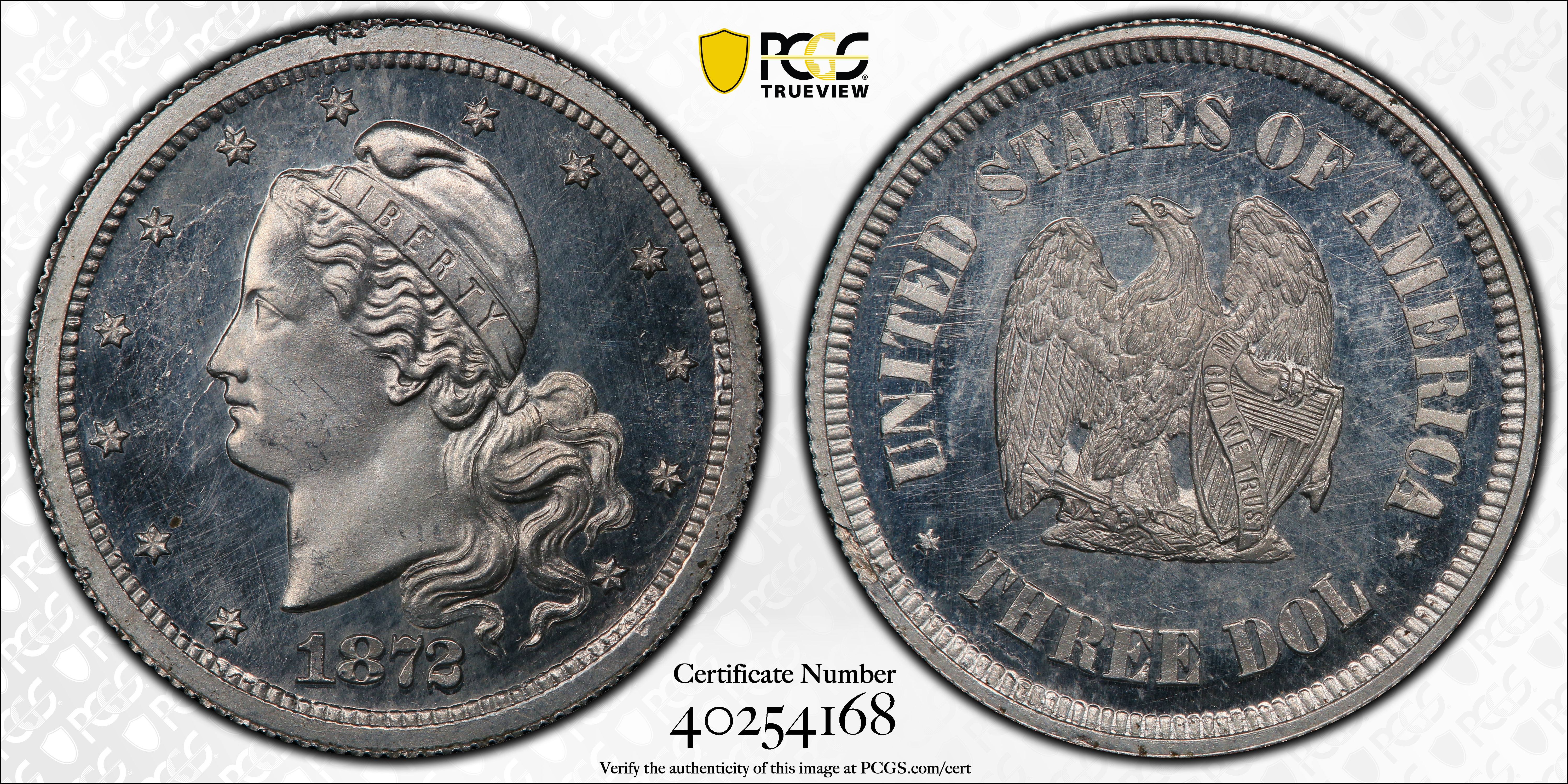 1872 $3 J-1237, CAM PR65CAM 认证号40254168, PCGS号389299