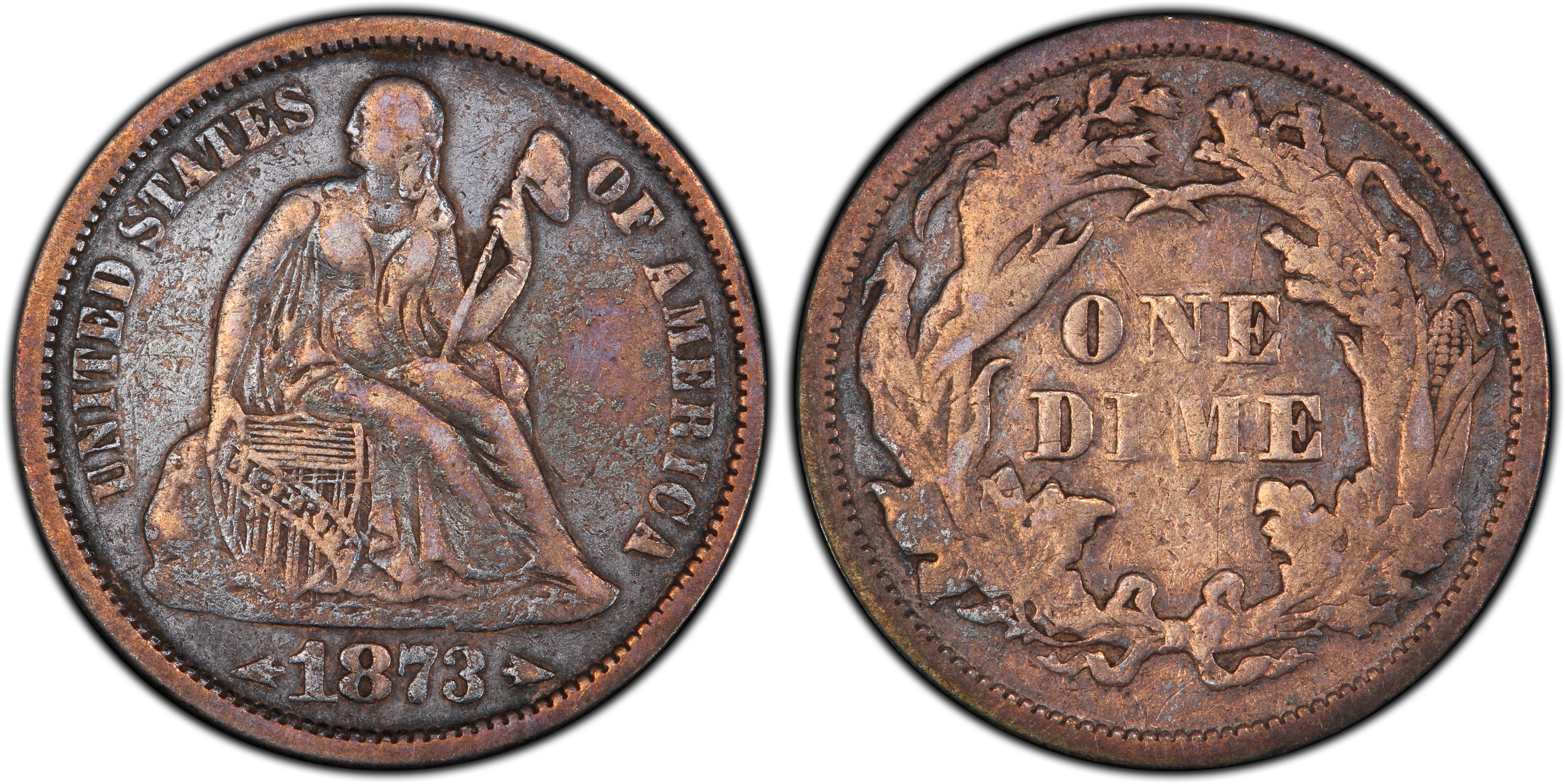 The 1873 Doubled Die Obverse Dime is a dramatic error that shows wild doubling of the shield held by Liberty's right arm (viewer's left). This is a fairly scarce variety that is very difficult to find in high grade. The finest example appears to be the PCGS AU58 once owned by mega-collectors Bob Simpson and Eugene Gardner, which sold in June 2014 for a record $23,500.