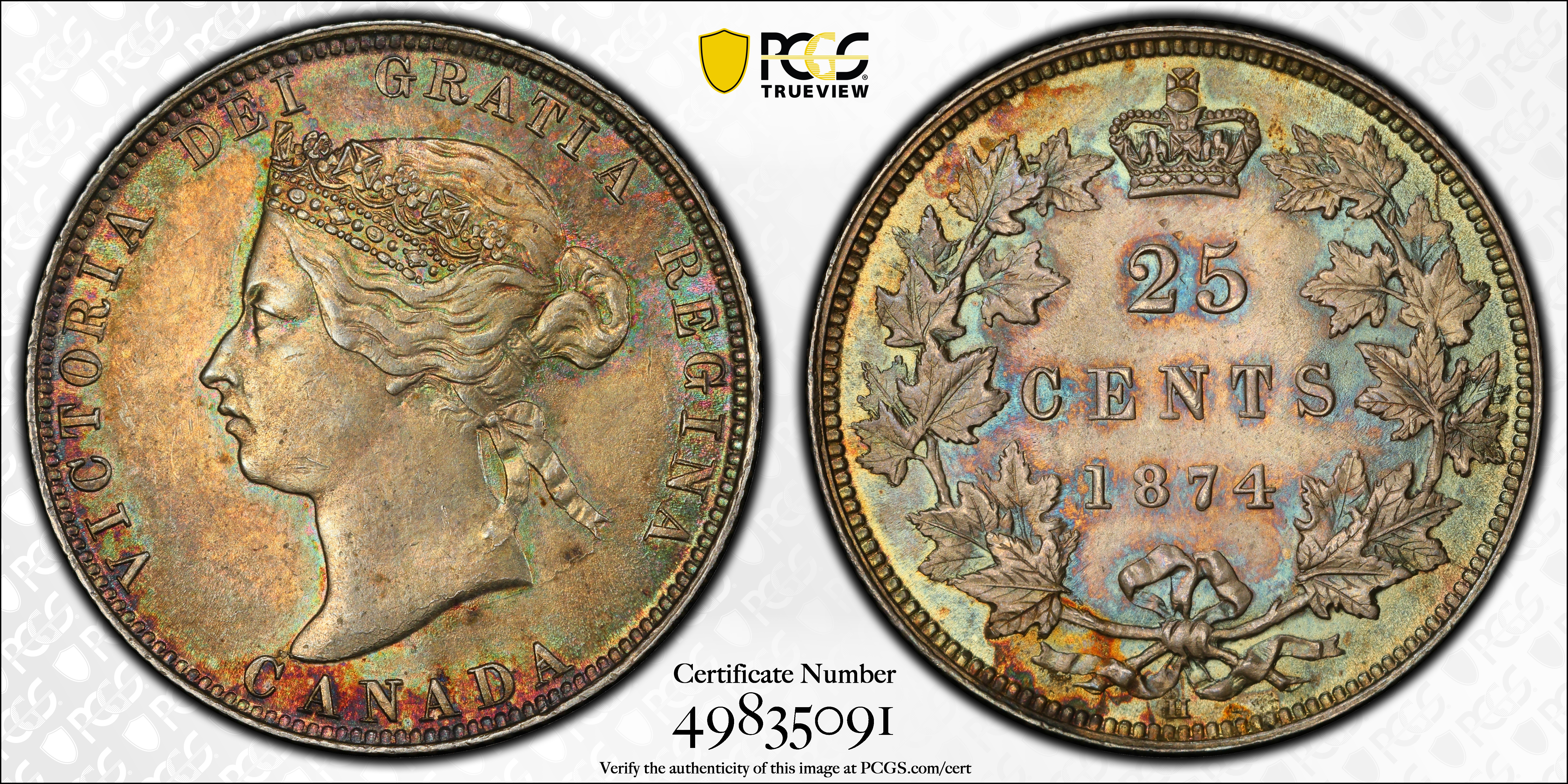 1874-H 25C MS64 认证号49835091, PCGS号31708