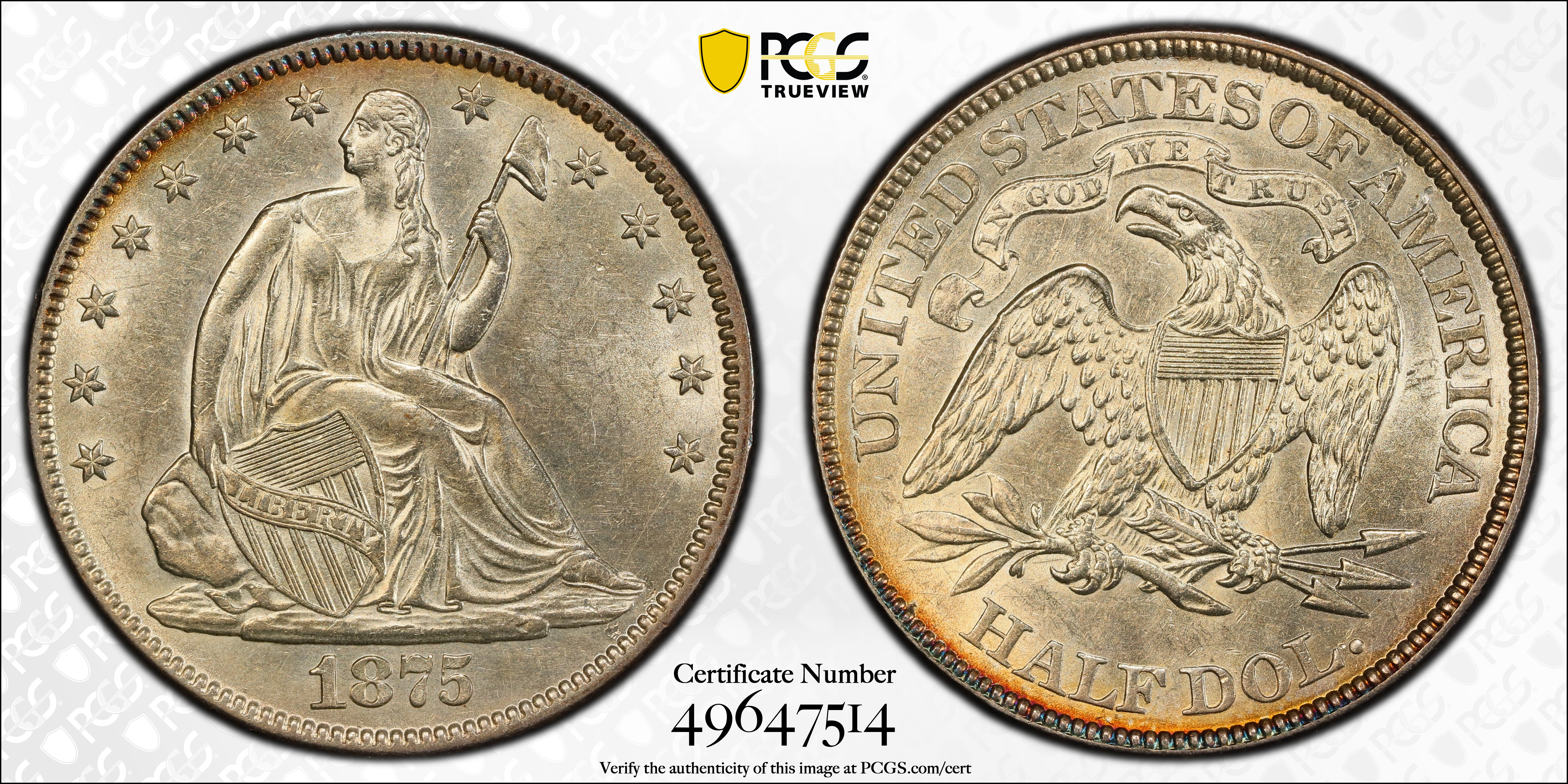 1875 50C AU58 认证号49647514, PCGS号6349
