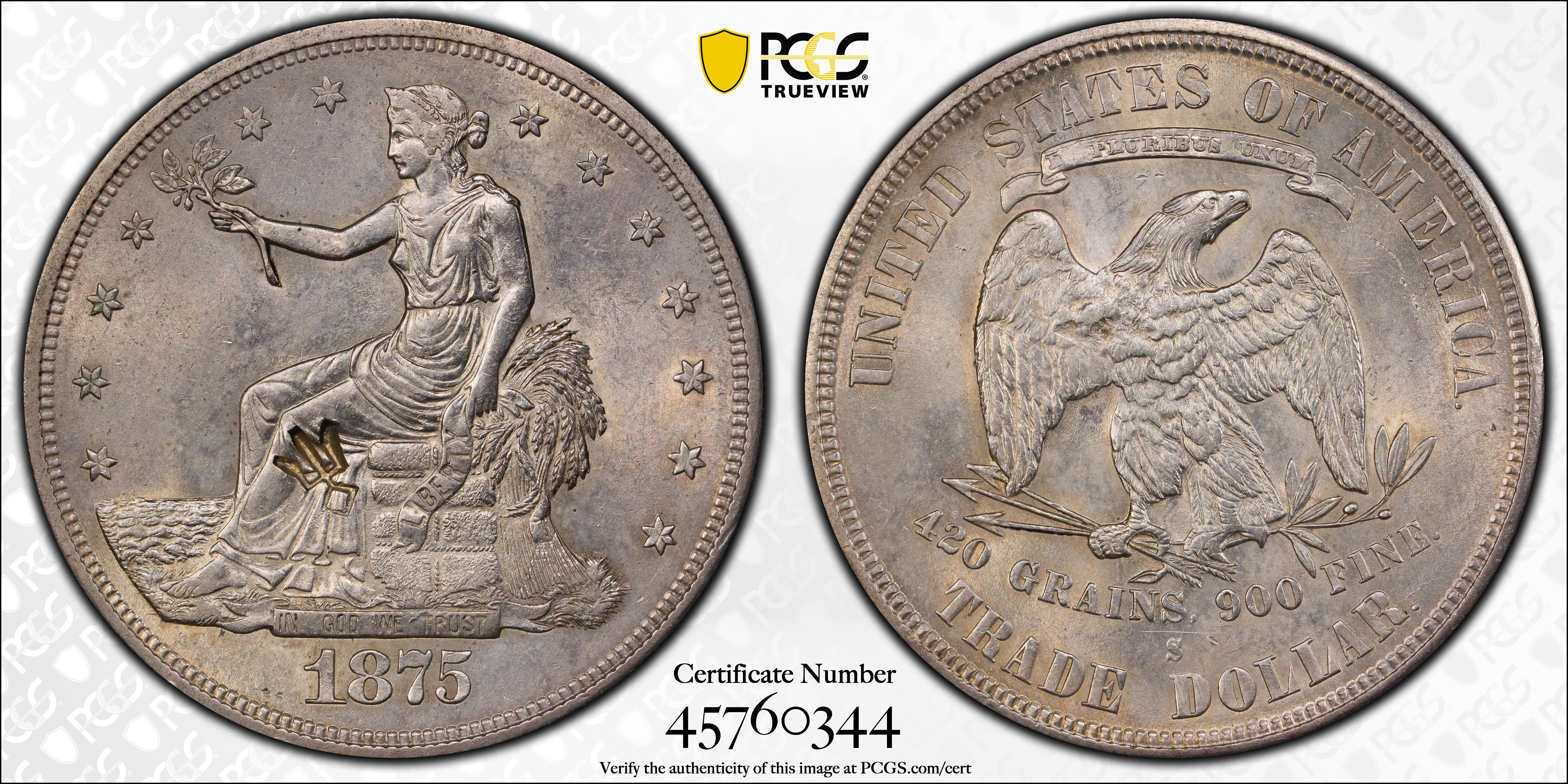 1875-S T$1 Type-I/II, Chopmarked MS61 认证号45760344, PCGS号517120