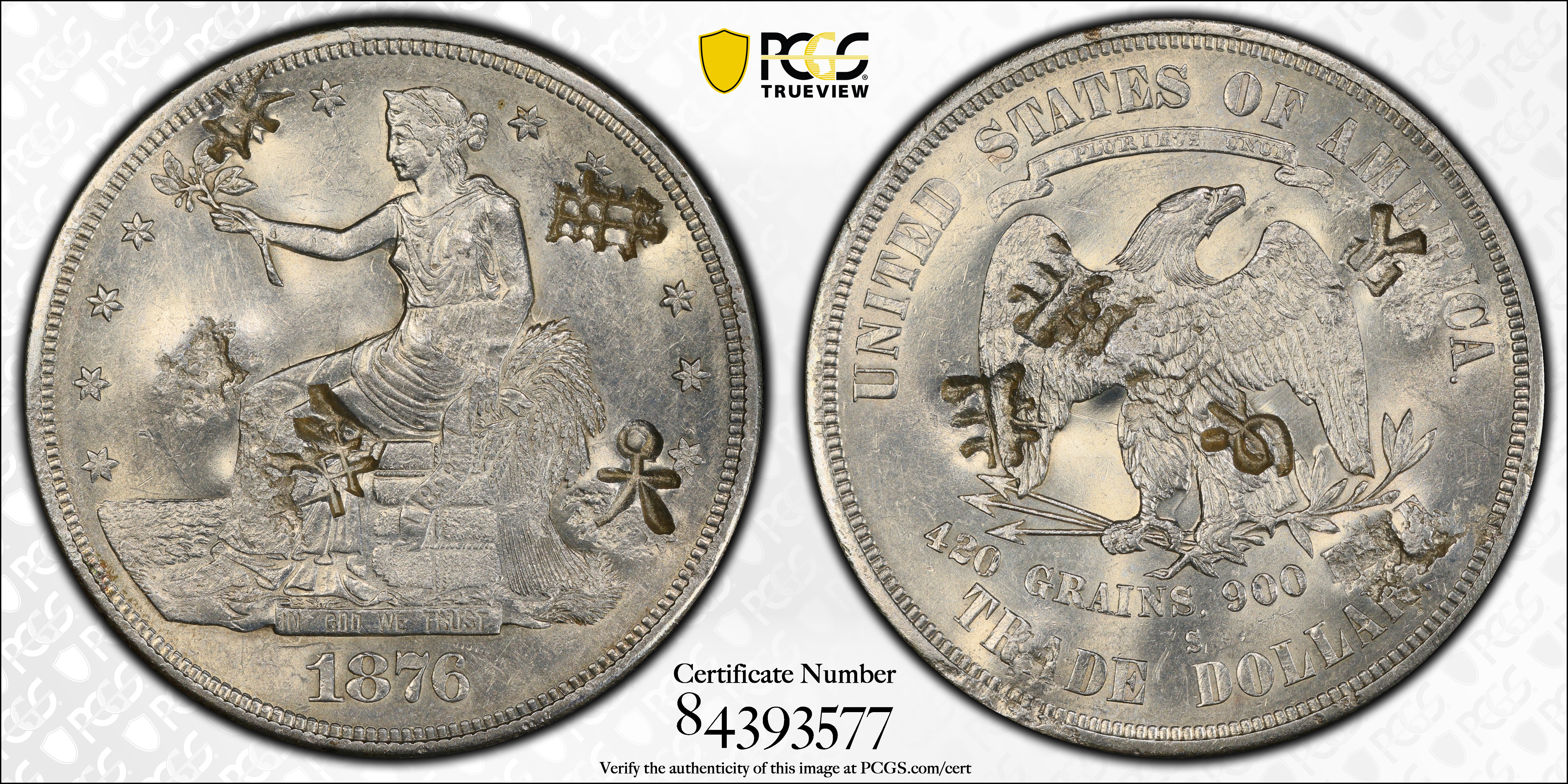 1876-S T$1 Type-I/I, Chopmarked MS61 认证号84393577, PCGS号813350