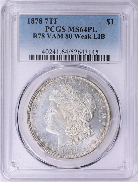 1878 7TF $1 R78 VAM 80 Weak LIB, PL MS64PL 认证号52643145, PCGS号40241