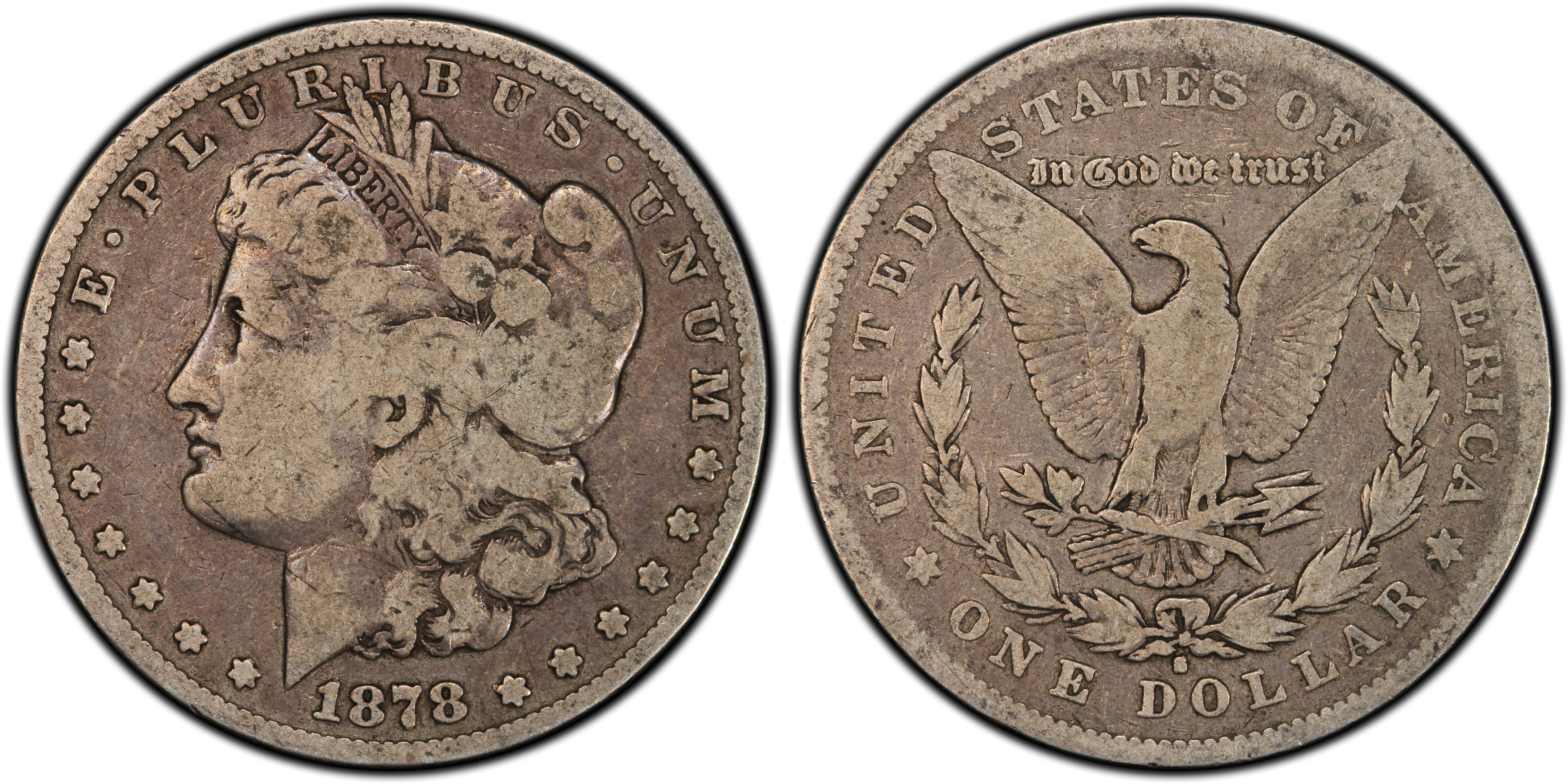 VAM 58 is one of nine "Long Nock" varieties identified among 1878-S Silver Dollars. "Long Nock" refers to the length of the arrowshaft as it extends out from the back of the arrow (a nock is the notch in the back of the arrow where the string of the bow is placed for launching). This is an easily identifiable variety not only because of the long arrow shaft, but also because of an obvious spike that protrudes from Liberty's eye (no other "Long Nock" 1878-S Dollar has this distinctive characteristic). On some examples a second spike protrudes from Liberty's eyelid, but this is not necessary for positive identification, nor can it be seen on all low-grade examples.