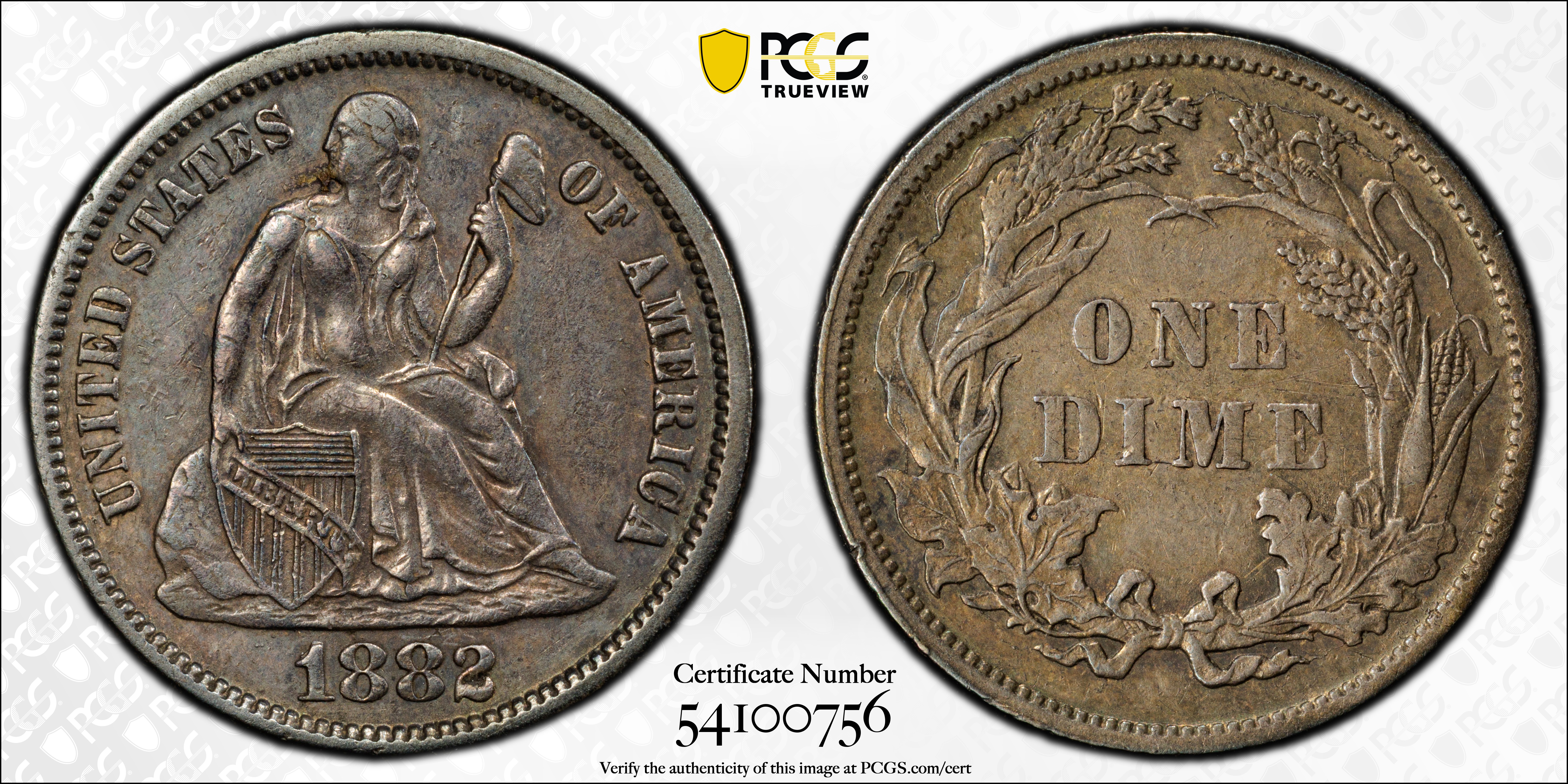 1882 10C Repunched Date, F-102 AU53 认证号54100756, PCGS号538648