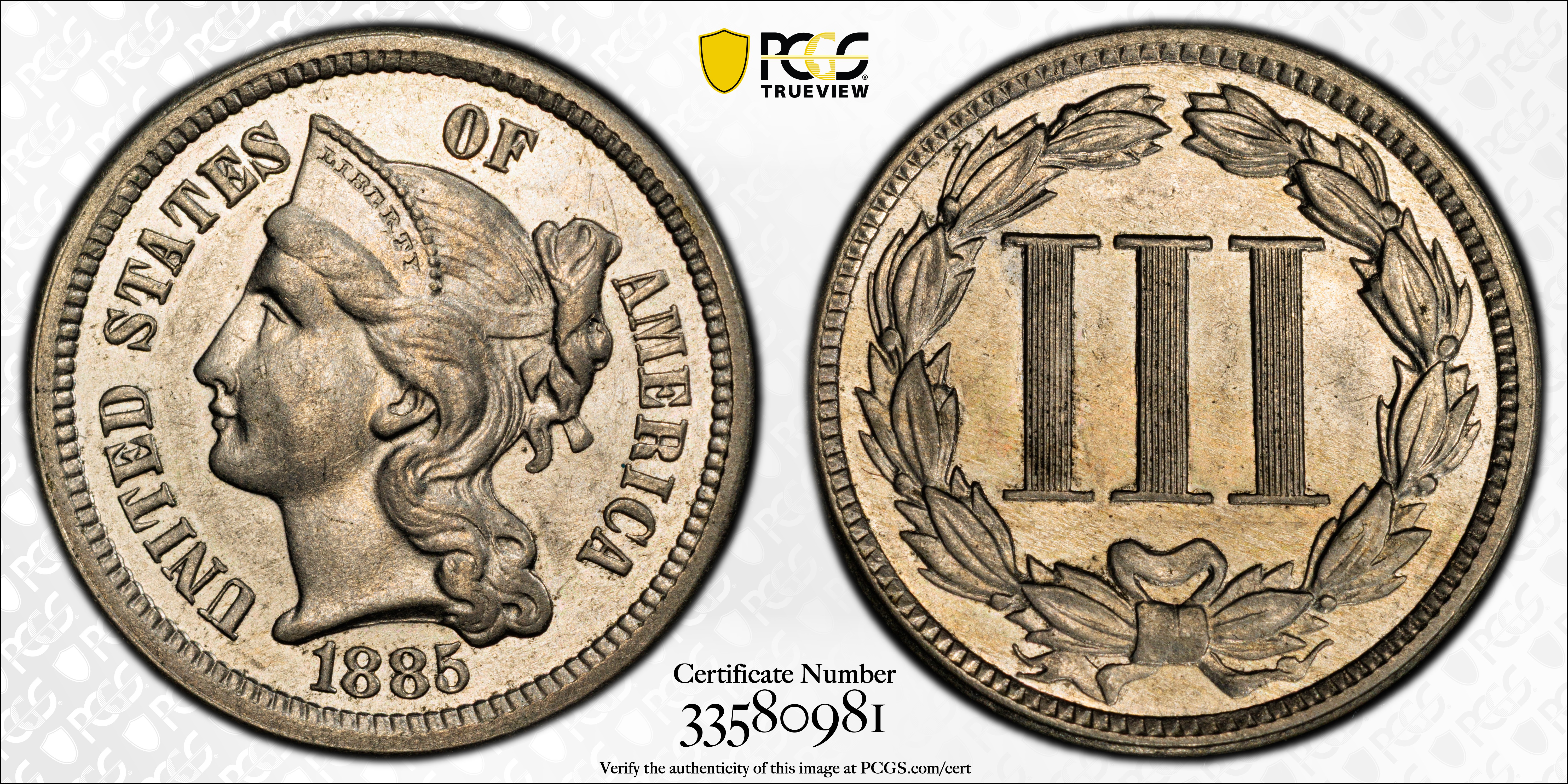 1885 3CN AU58 认证号33580981, PCGS号3753