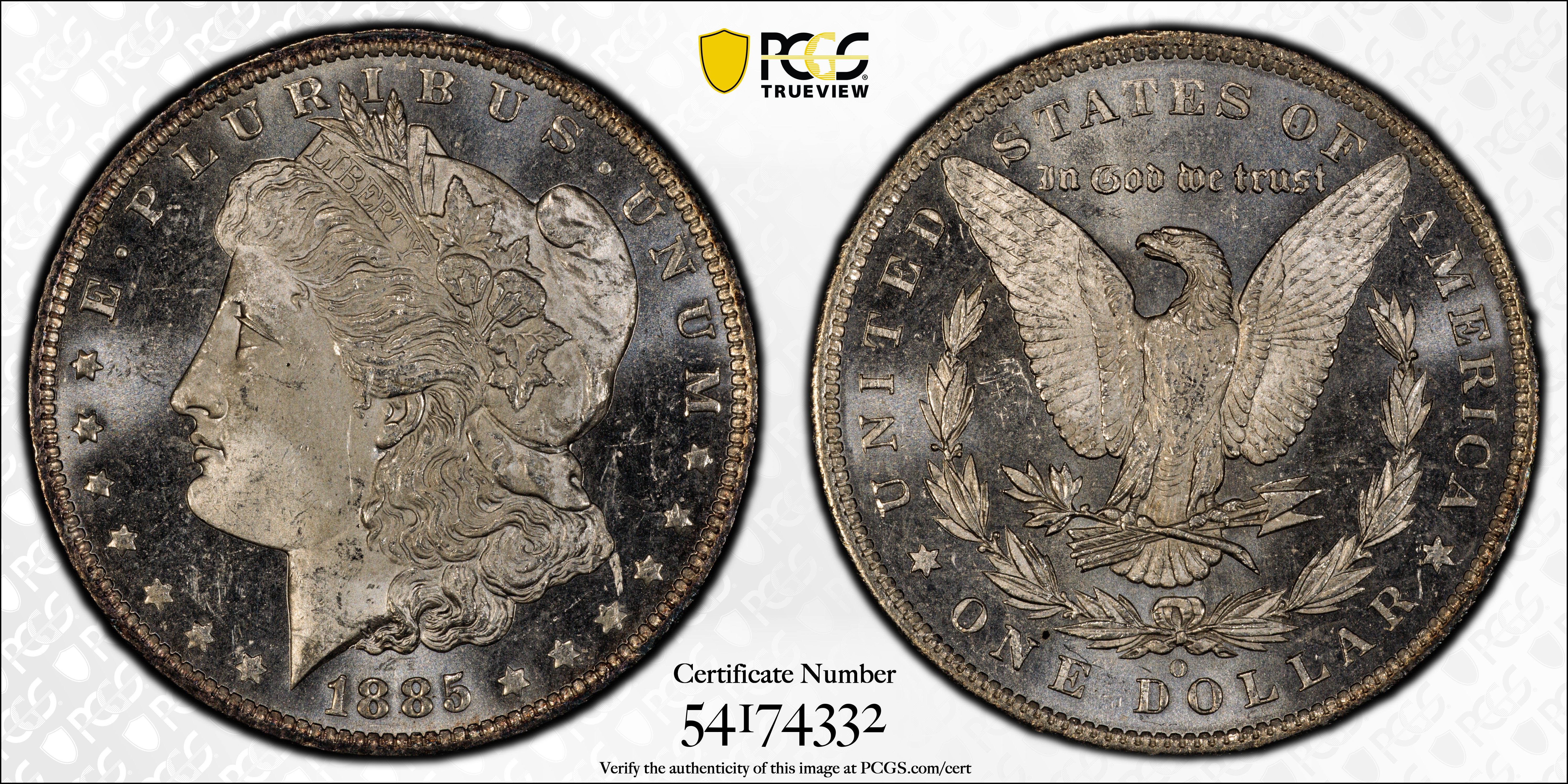 1885-O $1, PL MS65PL 认证号54174332, PCGS号7163