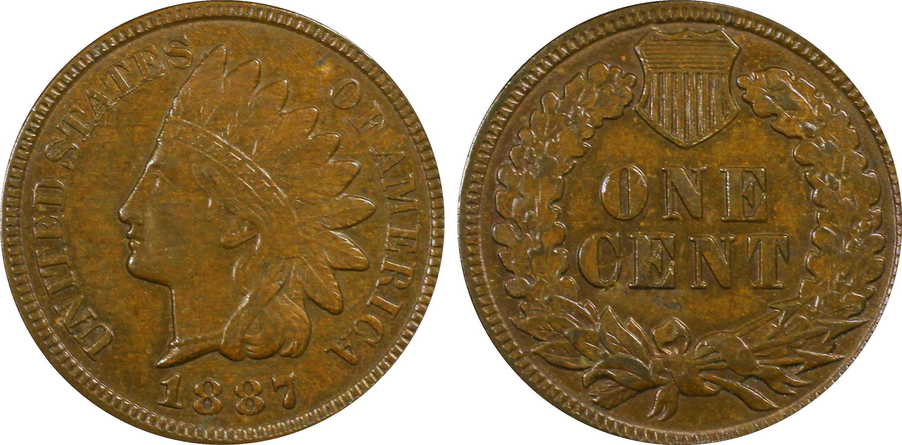 The 1887 Indian Head Cent is common in all grades, except as full Red Gems.