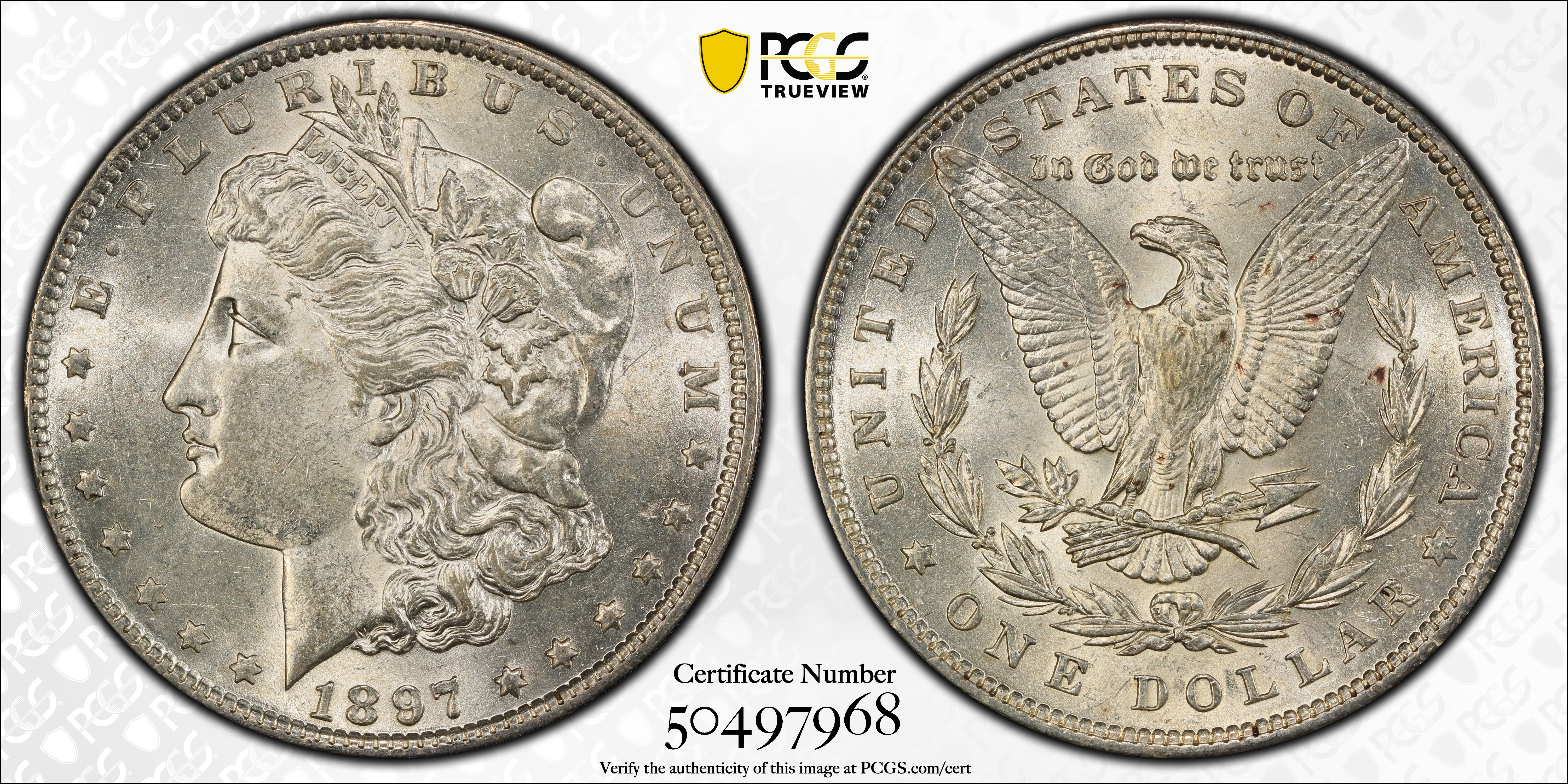 Mint State grades: Mint State 1897 dollars are common in all levels, although in MS-65 they are not among the top 10 most common Morgan dollar dates. Most are well struck and have satisfactory lustre. Others, particularly those in grades from MS-60 through 63, can have grayish, "greasy" surfaces.