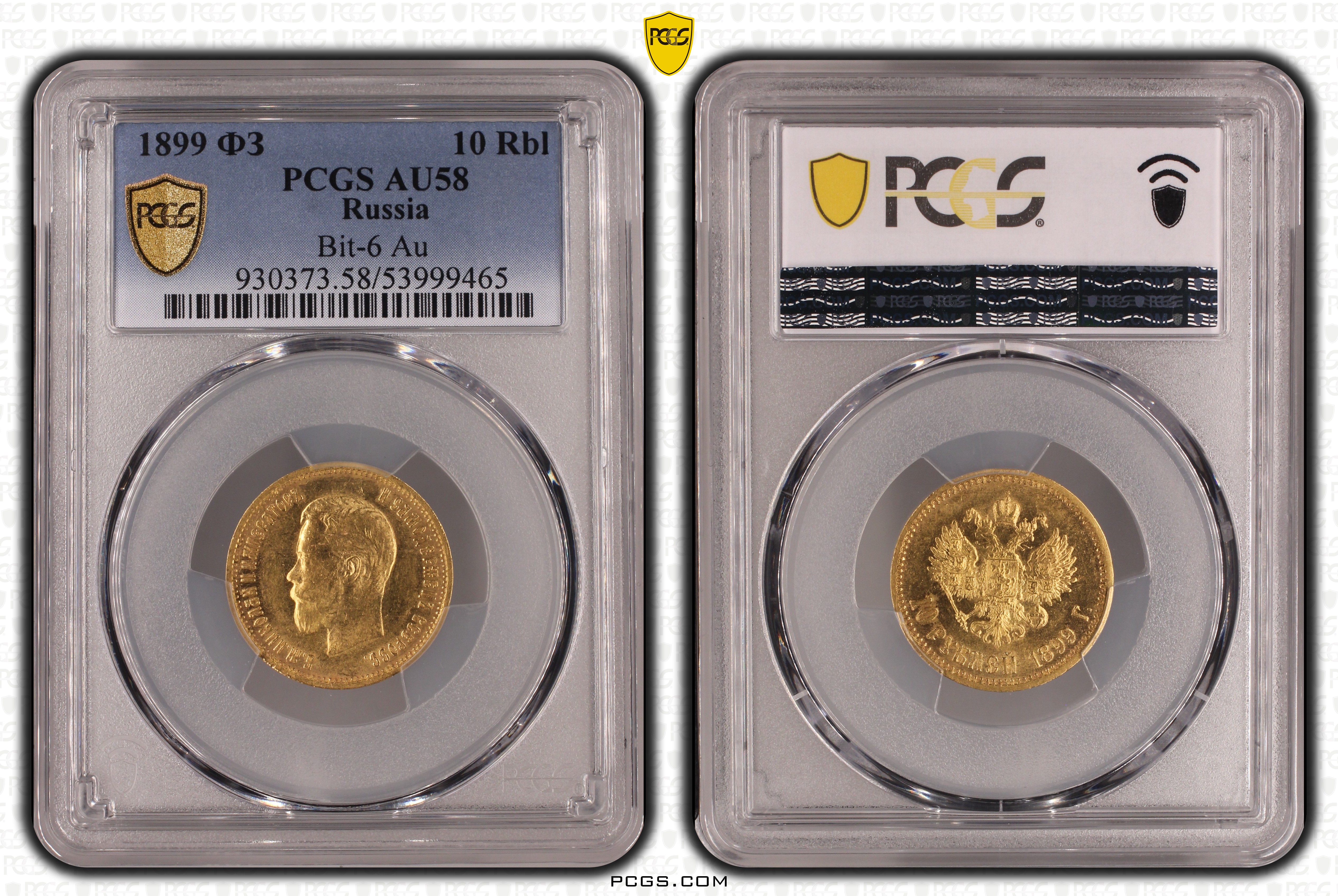 1899 ФЗ 10 Rbl Bit-6 Au AU58 认证号53999465, PCGS号930373