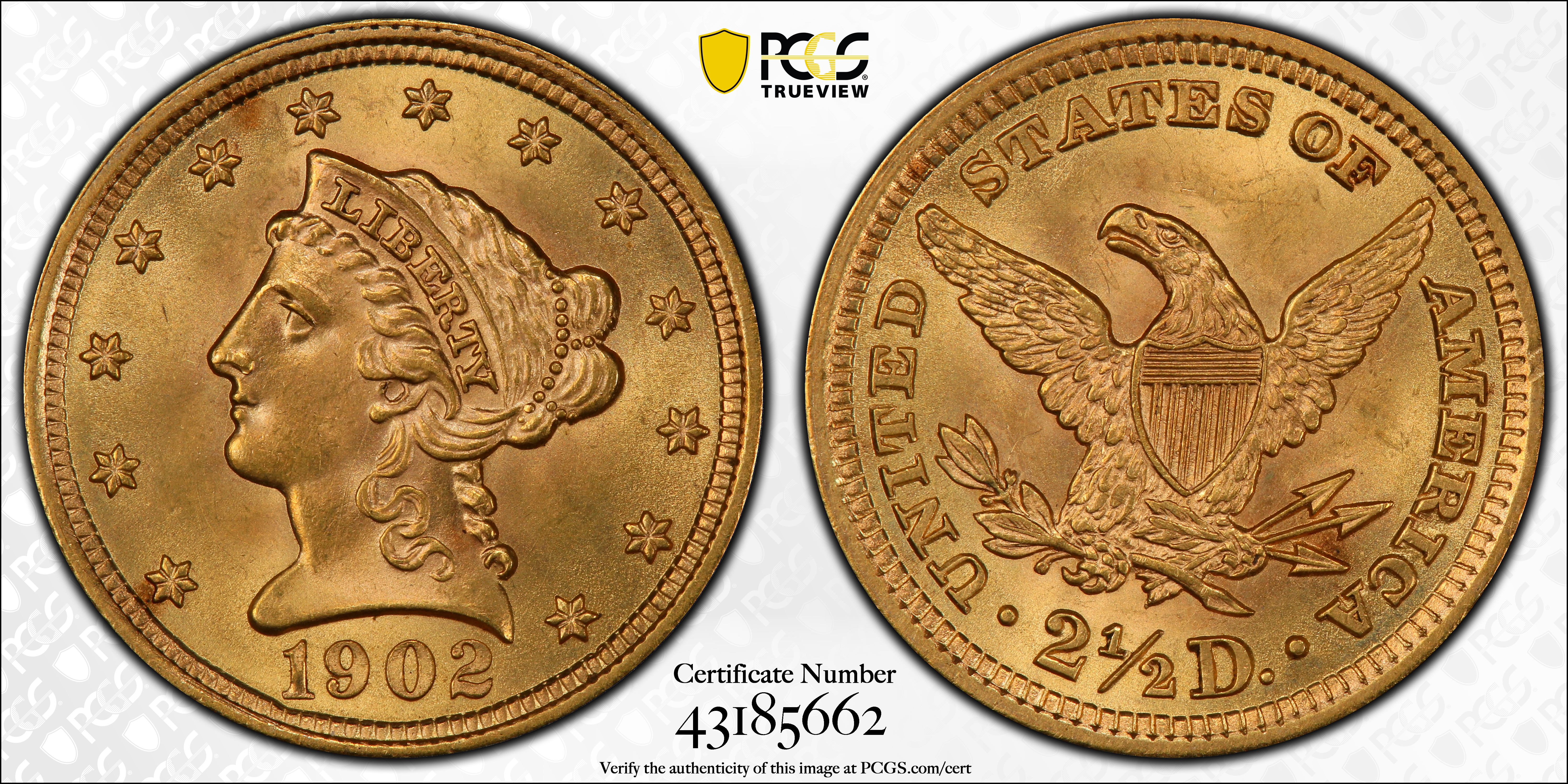 1902 $2.50 MS67 认证号43185662, PCGS号7854