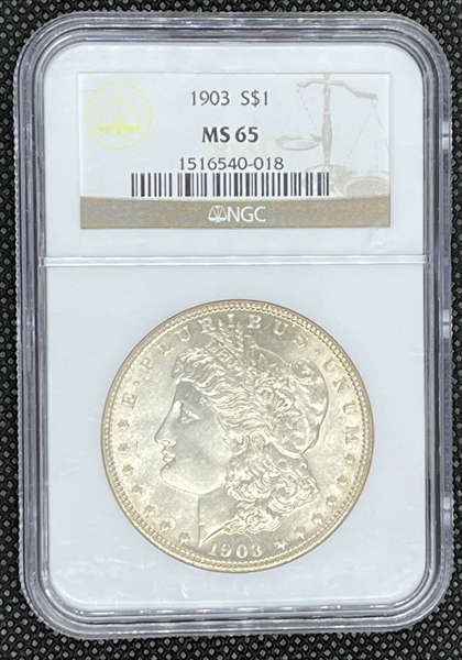 The 1903 Morgan Dollar is a very common coin thanks to numerous bags that have appeared on the market over the years. PCGS alone has certified over 13,000 examples of this date, with most falling into the MS64 to MS65 grade range. Superb examples are very scarce, but can be found occasionally in auction sales and in dealers' inventories. MS67 appears to be the last accessible grade.