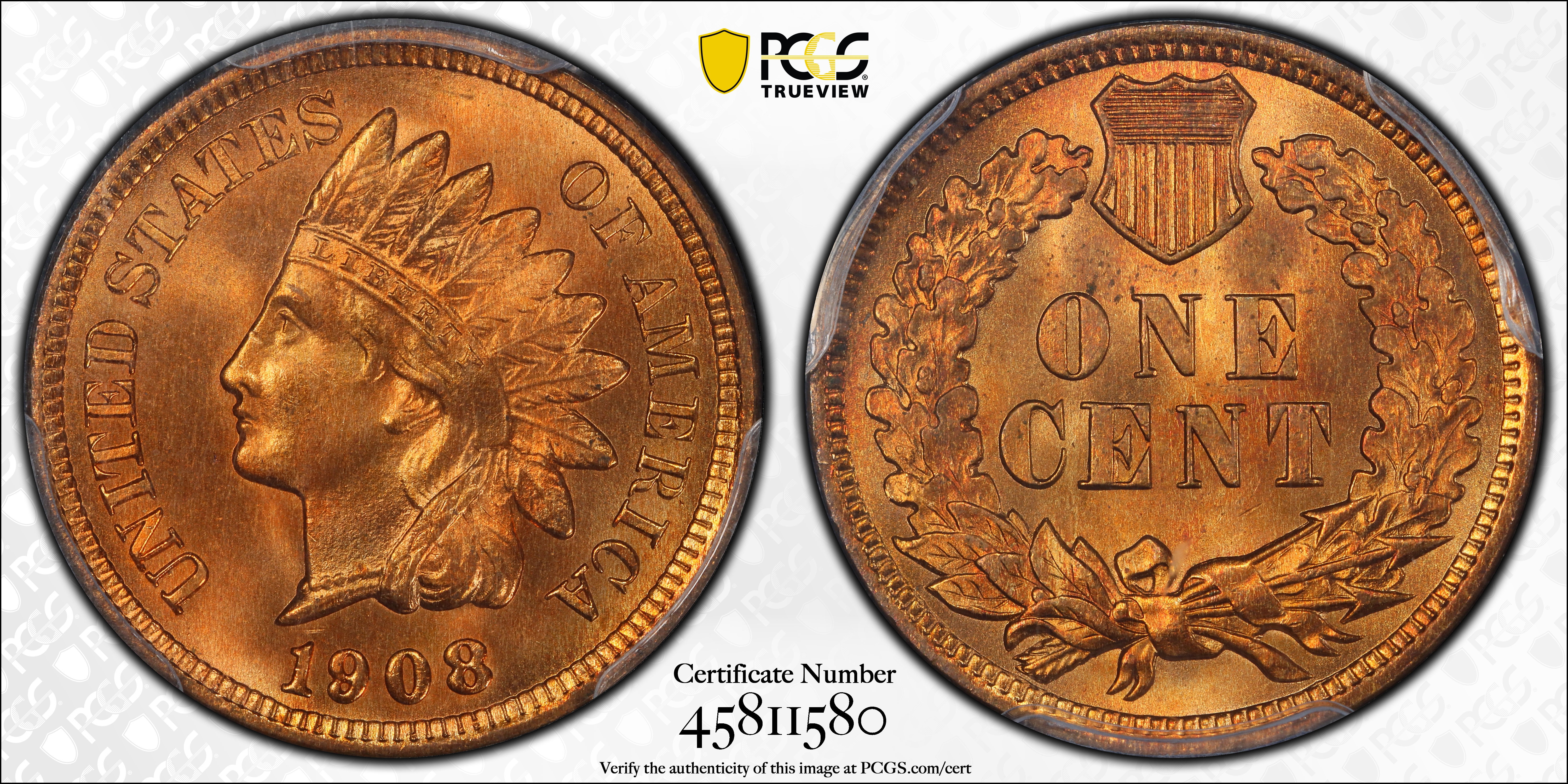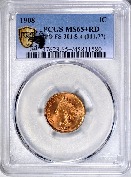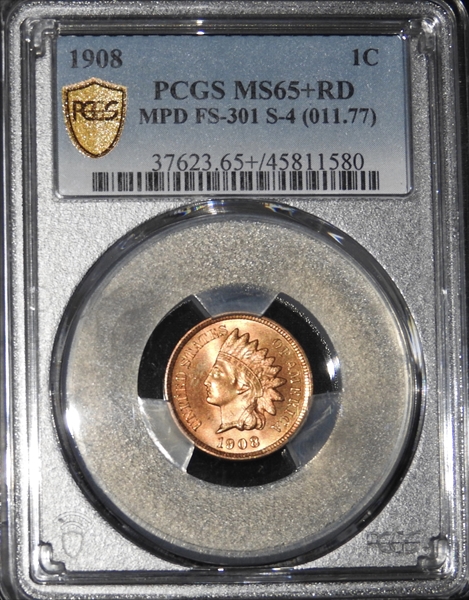 1908 1C MPD FS-301 S-4 (011.77), RD MS65+ RD 认证号45811580, PCGS号37623