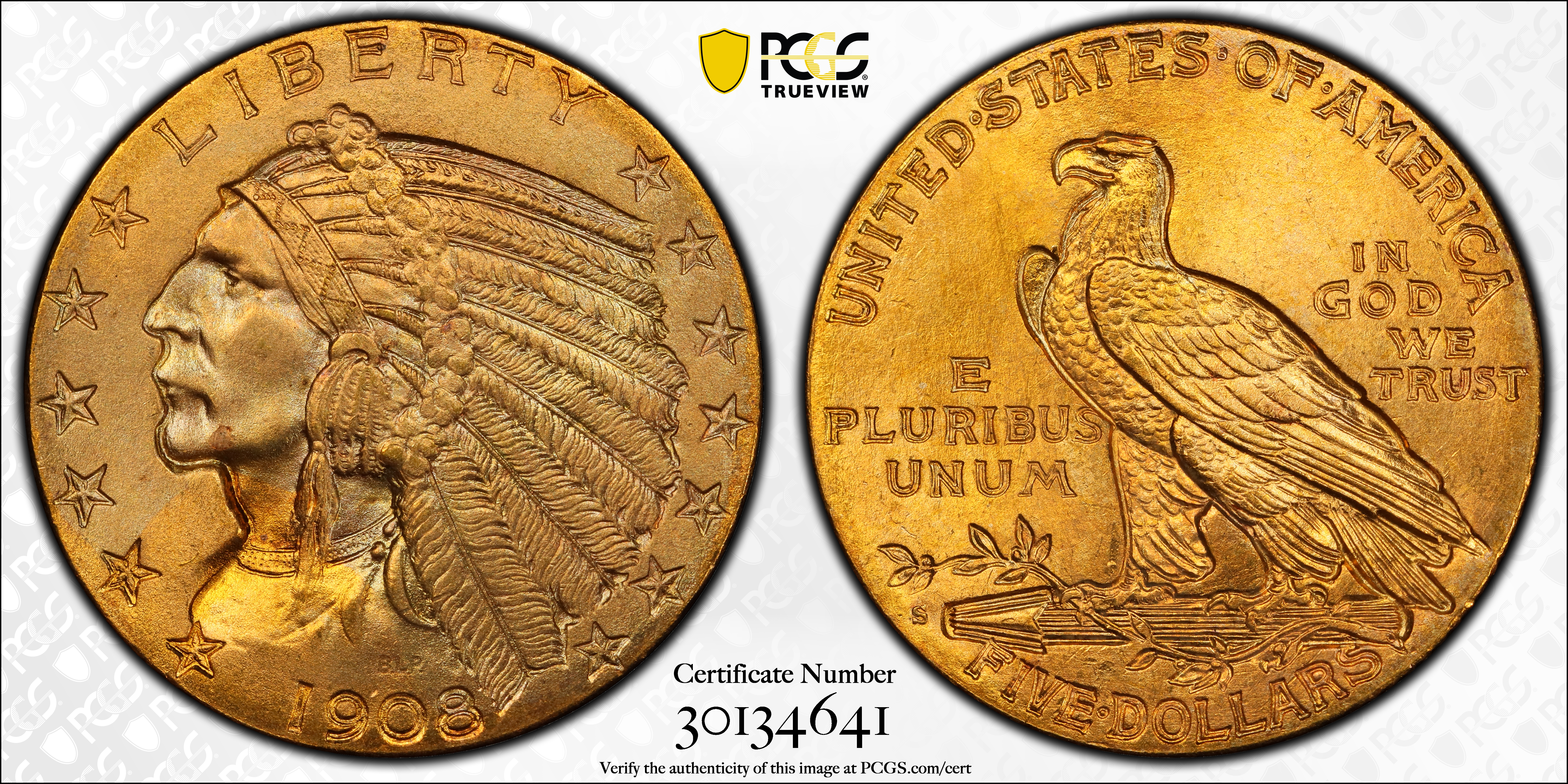 1908-S $5 MS67 认证号30134641, PCGS号8512