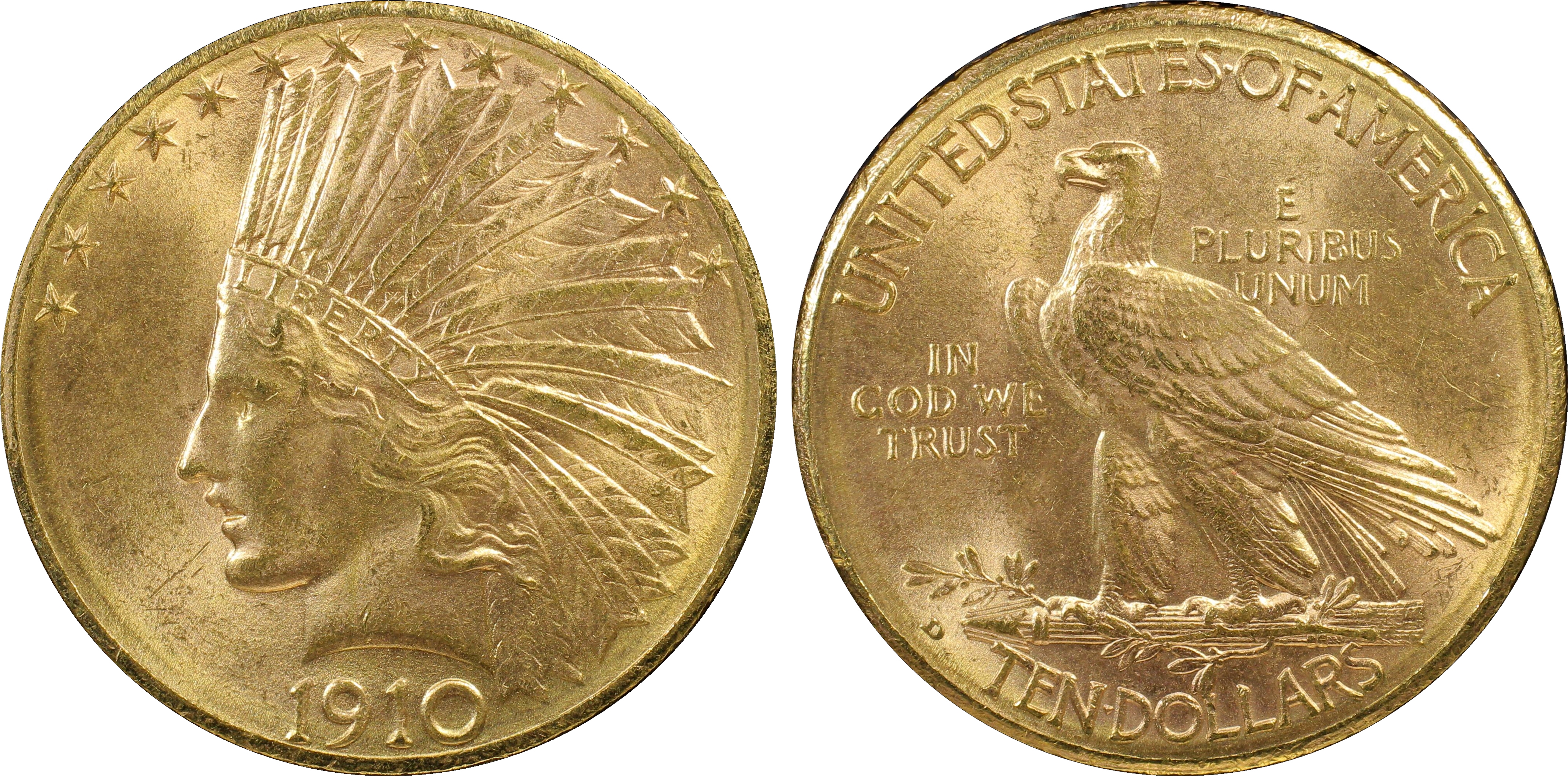 By a very large margin the 1910-D is the most common branch mint Idian Head eagle. In fact, it is one of the commonest eagles of this type and is very easy to obtain in MS-63 or lower condition and is not much harder to find in MS-64. True gems are also encountered with comparative regularity. A few really top quality (better than MS-65) specimens also exist. Kruthoffer's was essentially superb and a couple of others are basically equal to it.The strike on a typical 1910-D is very sharp, and the lustre is generally good to very good but certainly not outstanding. All specimens I have seen are frosty with finely granular surfaces, and the color is most often a light to medium orange and greenish gold. Many specimens have what appears to be an inner "rim" running through the middle of the date and the stars on the obverse and through the middle of the legends on the reverse. This "rim" runs the entire circumference of the coin on both the obverse and reverse and is probably the result of die bulging.