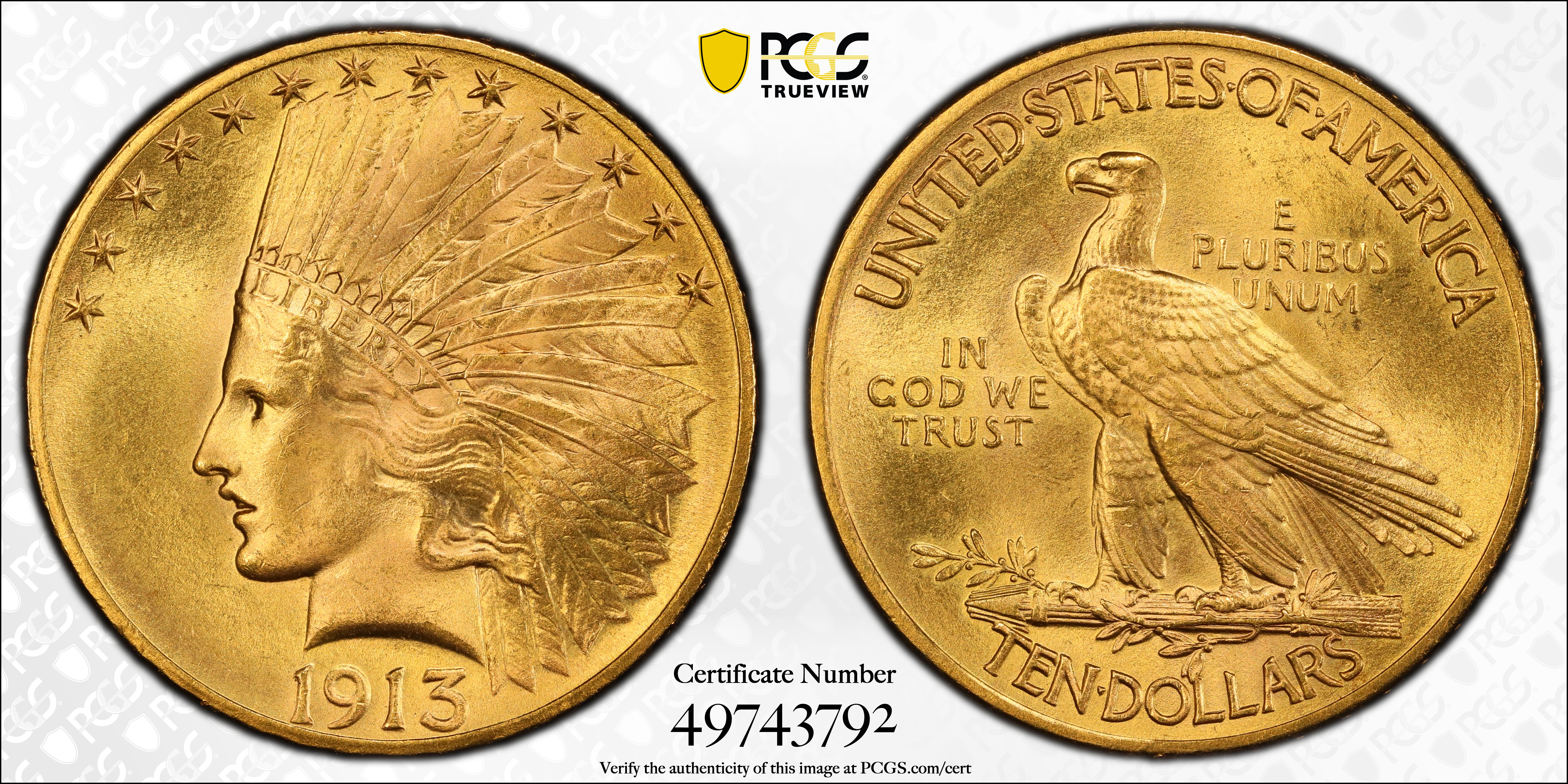 1913 $10 MS65+ 认证号49743792, PCGS号8873