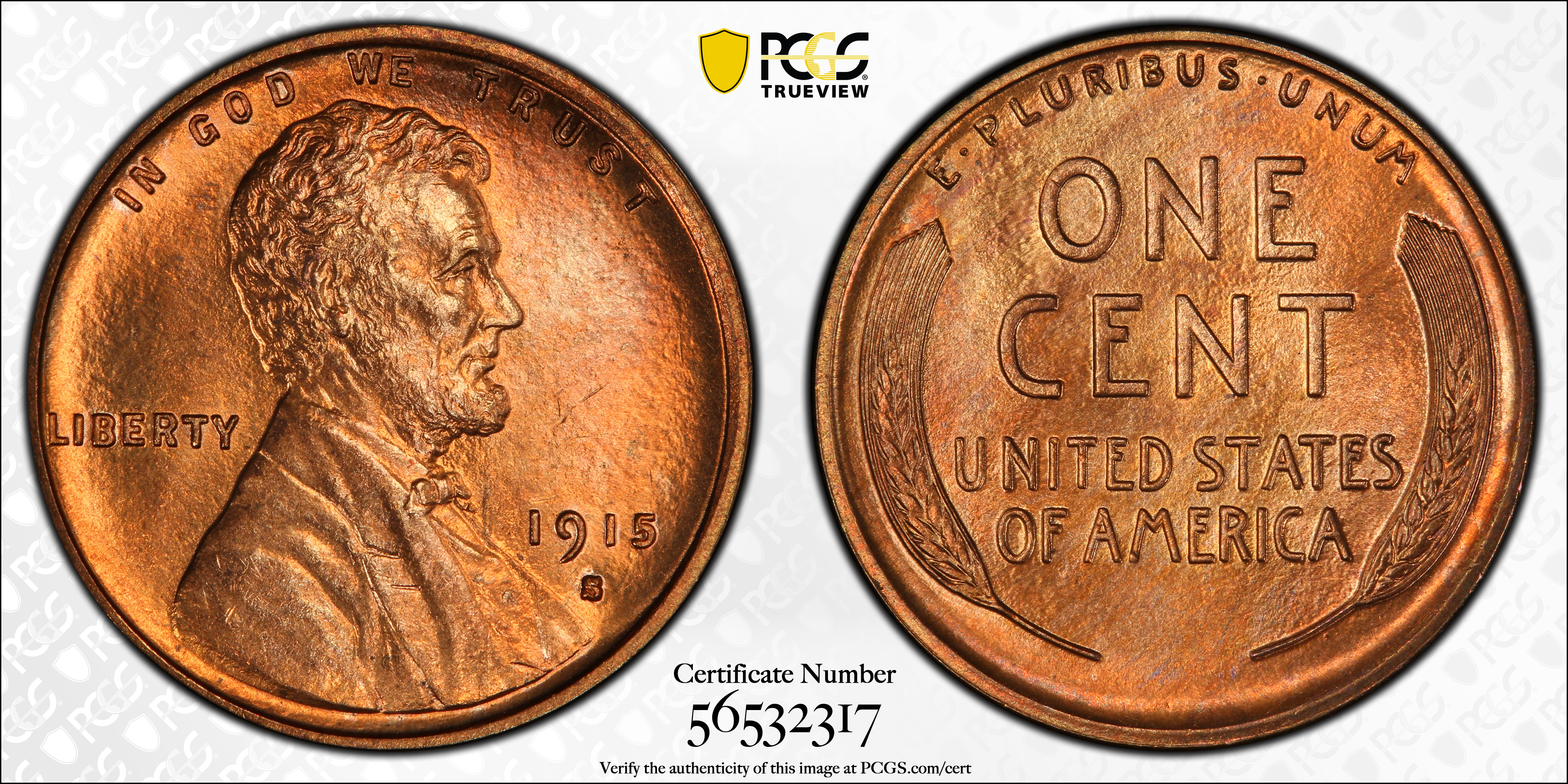 1915-S 1C, RD MS66+ RD 认证号56532317, PCGS号2485