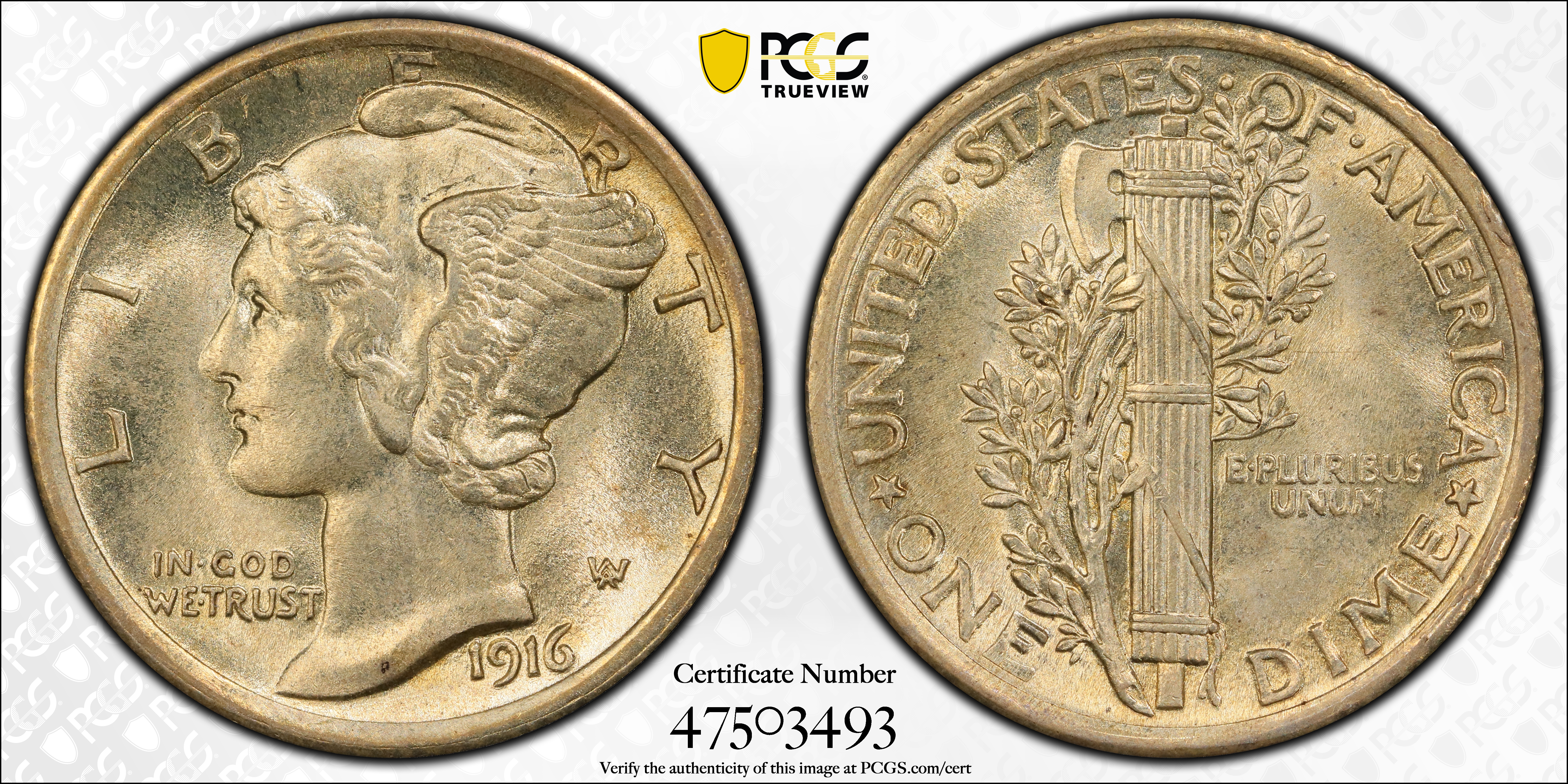 1916 10C Mercury, FB MS65FB 认证号47503493, PCGS号4905