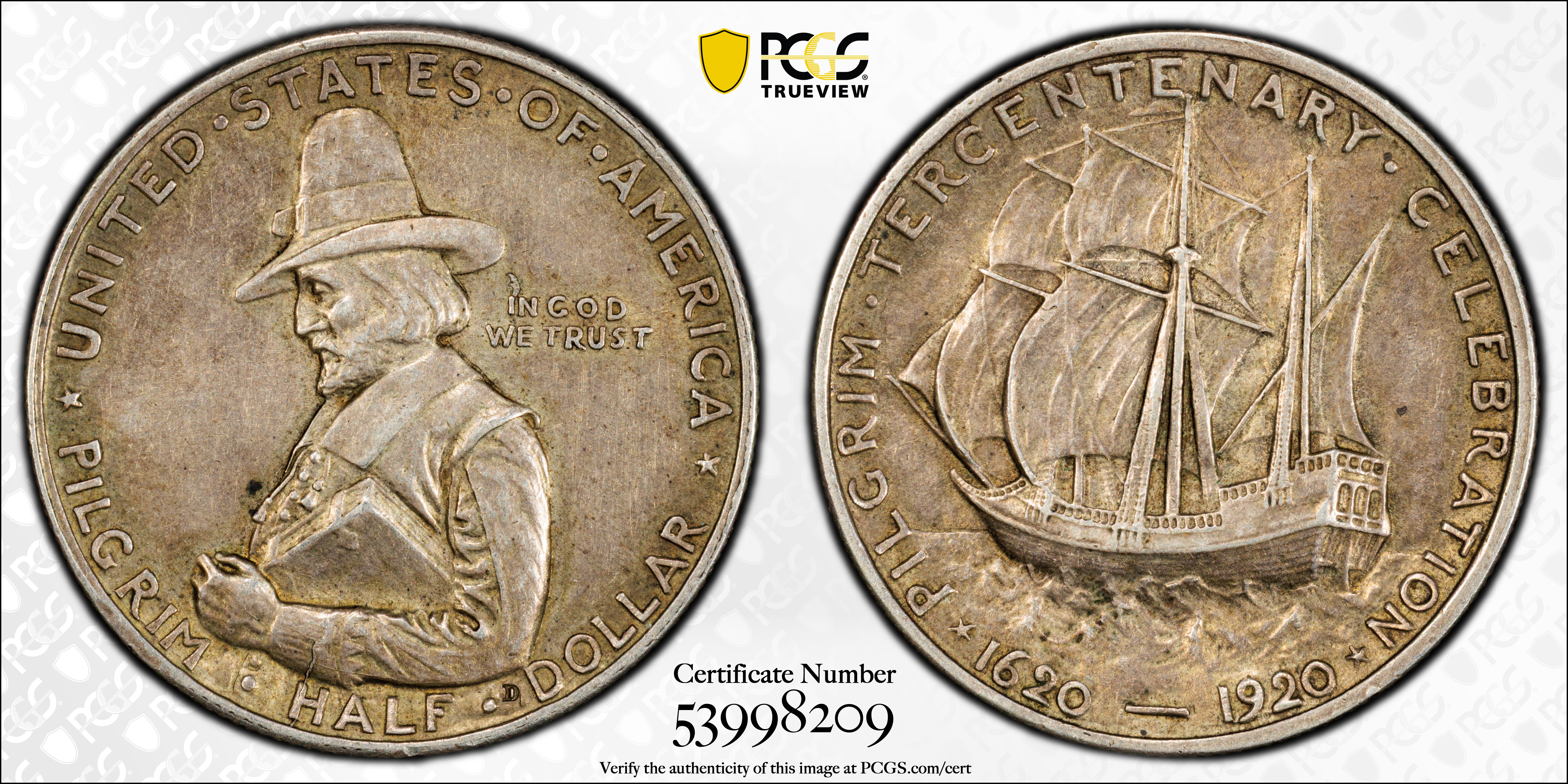 1920 50C Pilgrim AU58 认证号53998209, PCGS号9359