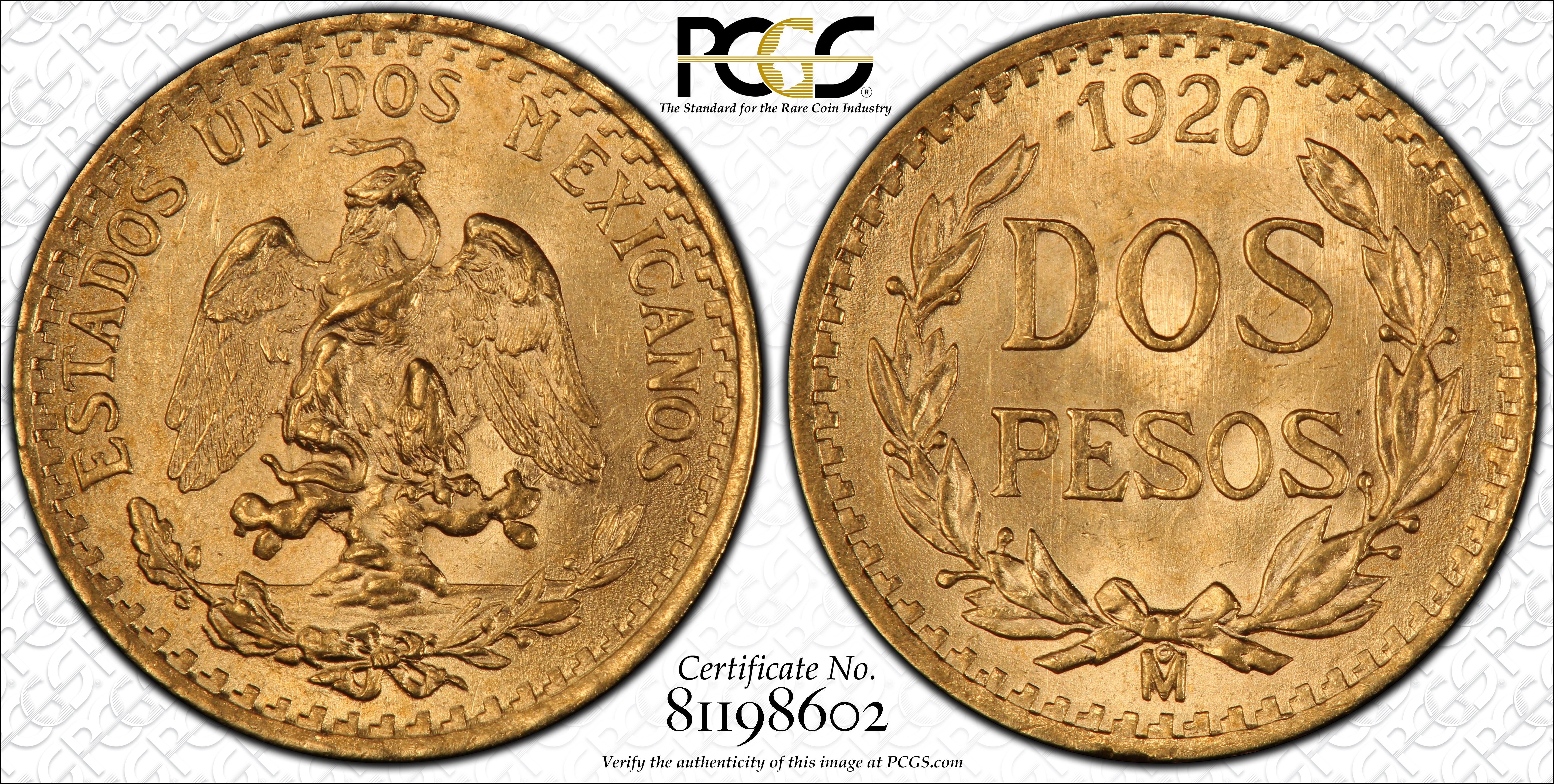 1920-Mo 2 Peso KM-461 Au MS65 认证号81198602, PCGS号526000
