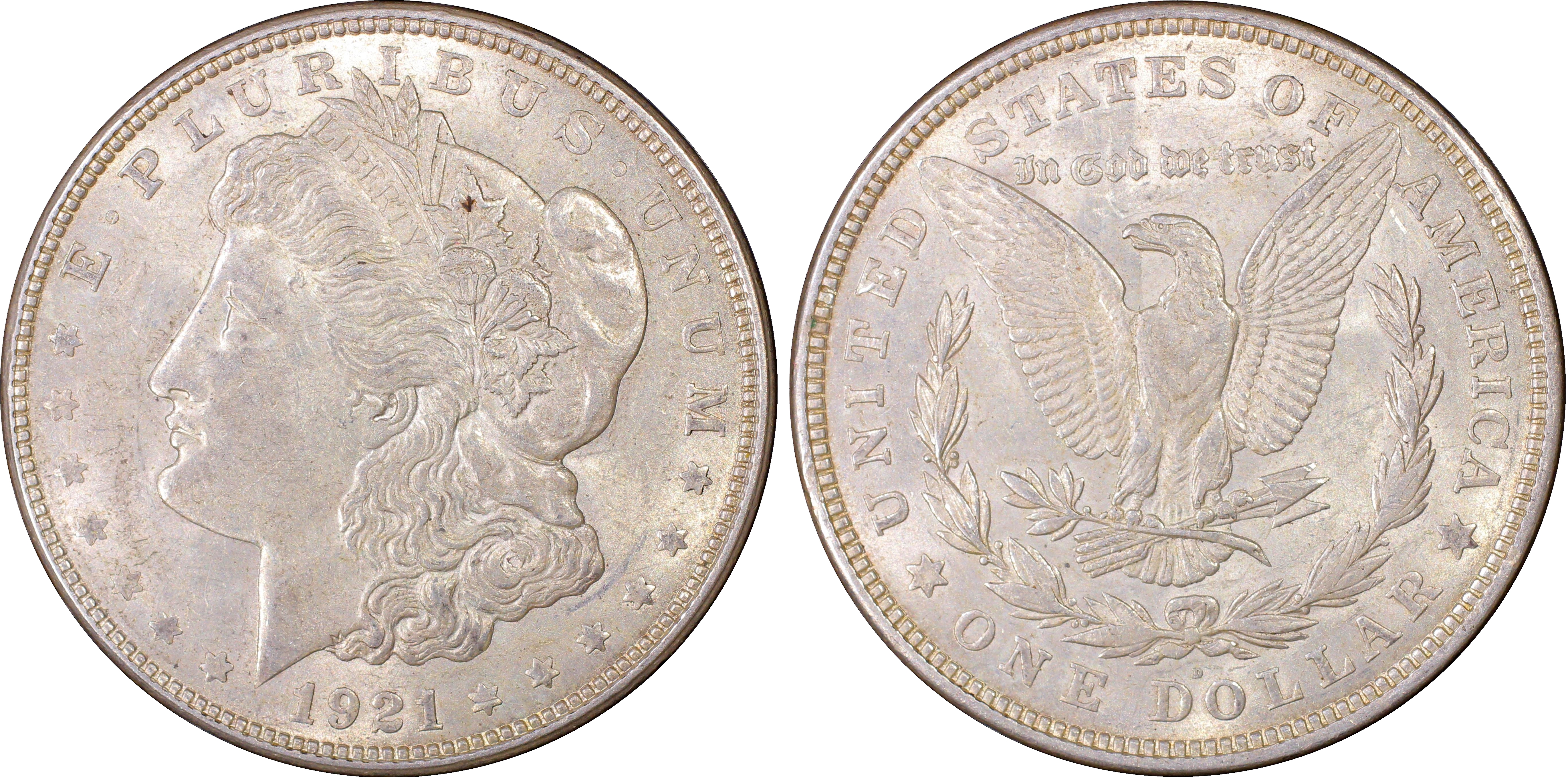 Mint State grades: The typical Mint State coin is in lower grades such as MS-60, 61, or 62, and is an average strike, but some are well struck. As the dies were in shallow relief, a sharp strike is not as distinctive as one of the earlier 1878-1904 era. The surfaces are often frosty and lustrous, a point in their favor. As is the case with 1921 Philadelphia Mint Morgan dollars, a certified 1921-D is apt to have a poor aesthetic appearance.