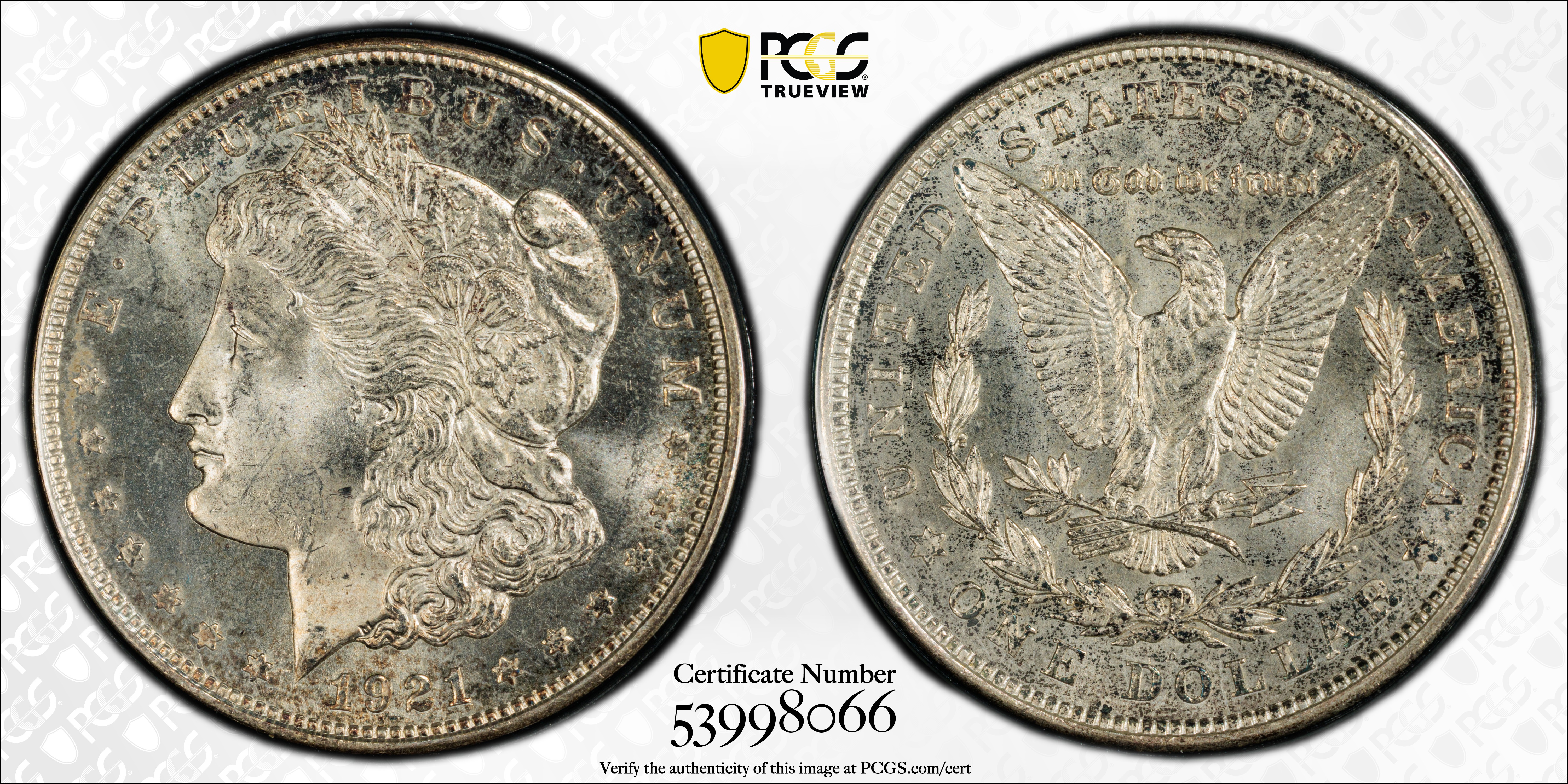 Mint State grades: The typical Mint State coin is in lower grades such as MS-60, 61, or 62, and is an average strike, but some are well struck. As the dies were in shallow relief, a sharp strike is not as distinctive as one of the earlier 1878-1904 era. The surfaces are often frosty and lustrous, a point in their favor. As is the case with 1921 Philadelphia Mint Morgan dollars, a certified 1921-D is apt to have a poor aesthetic appearance.