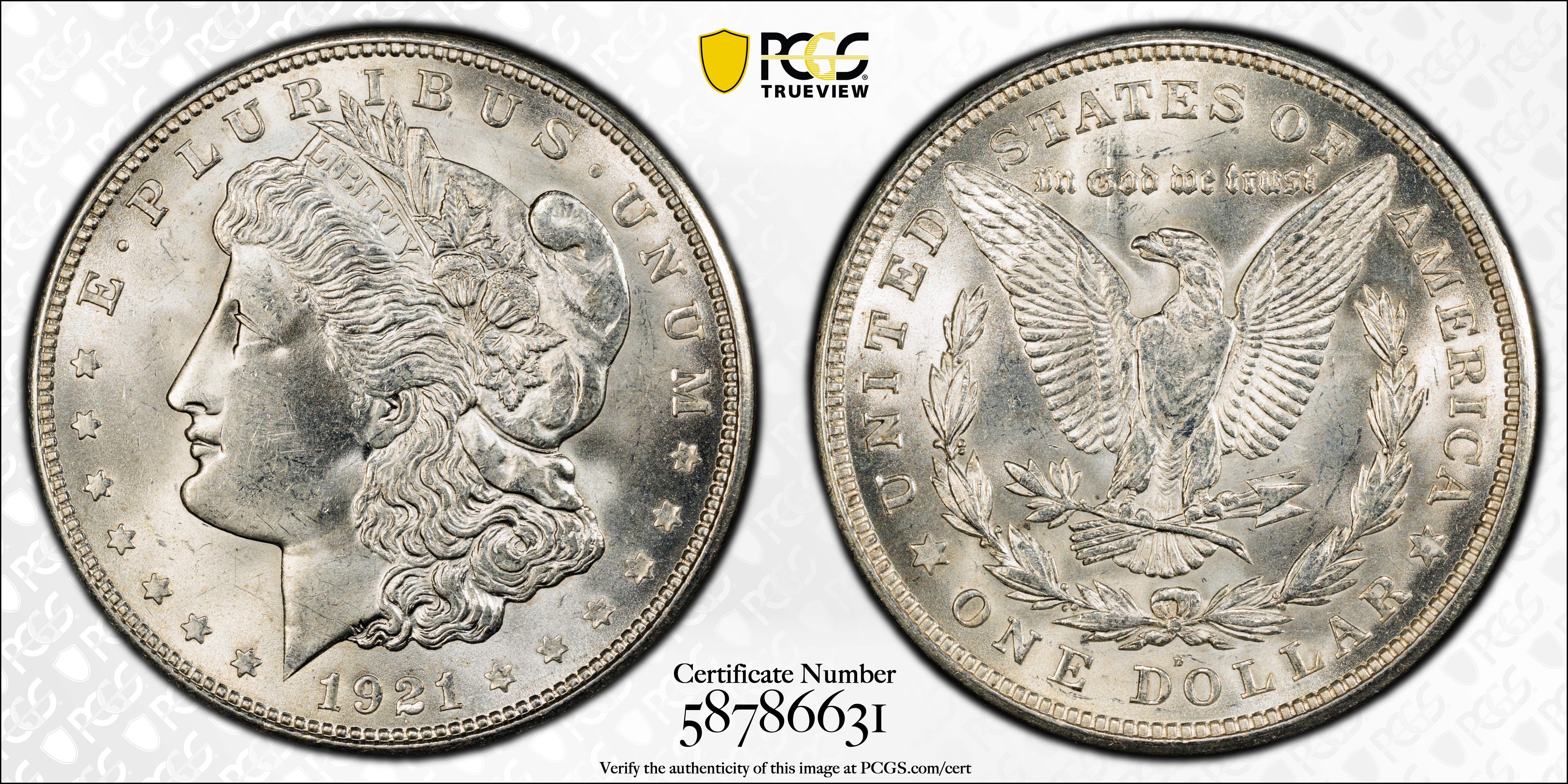 Mint State grades: The typical Mint State coin is in lower grades such as MS-60, 61, or 62, and is an average strike, but some are well struck. As the dies were in shallow relief, a sharp strike is not as distinctive as one of the earlier 1878-1904 era. The surfaces are often frosty and lustrous, a point in their favor. As is the case with 1921 Philadelphia Mint Morgan dollars, a certified 1921-D is apt to have a poor aesthetic appearance.