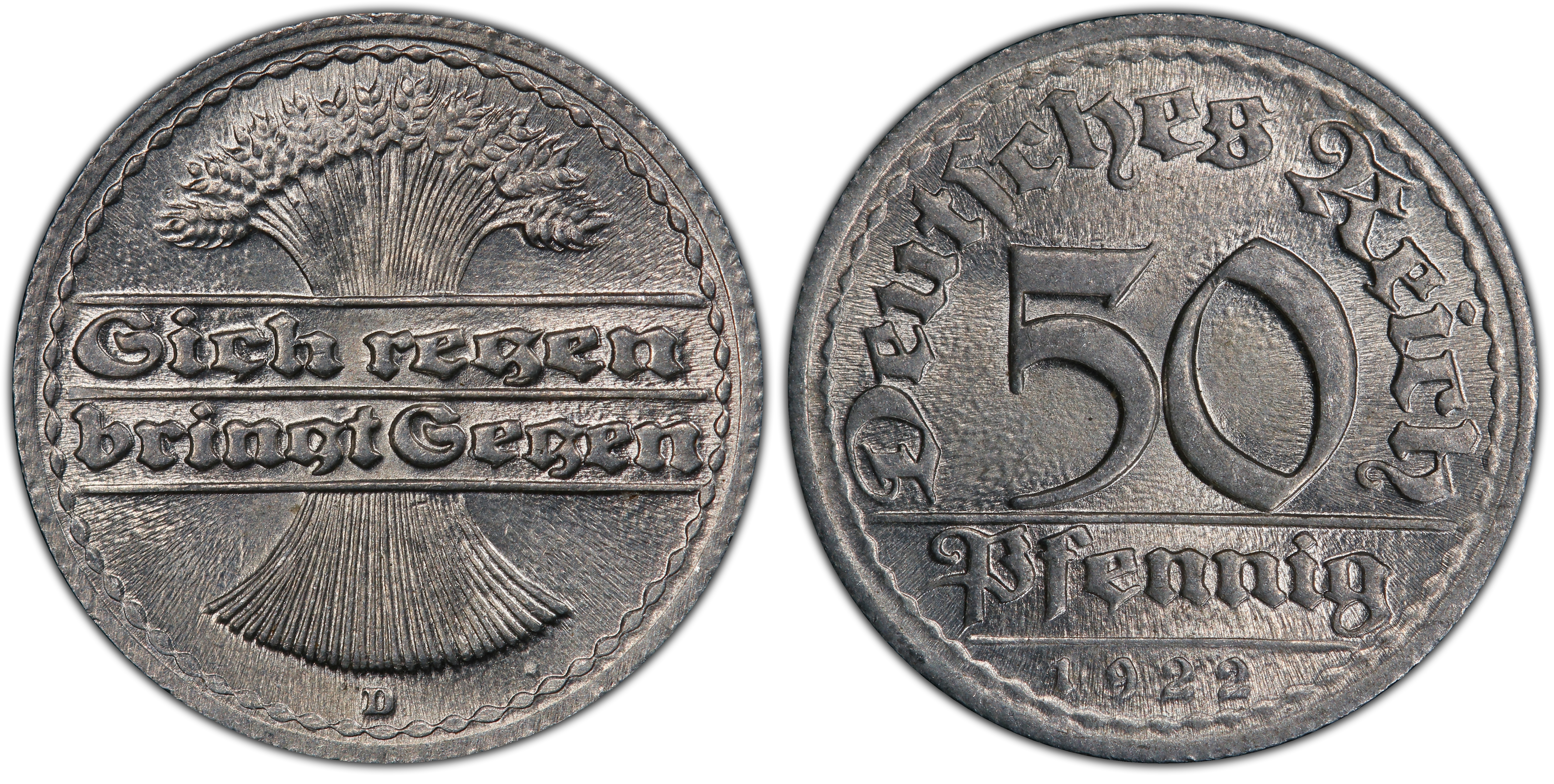 1922-D 50 Pfg J-301 MS66 认证号42718991, PCGS号301242