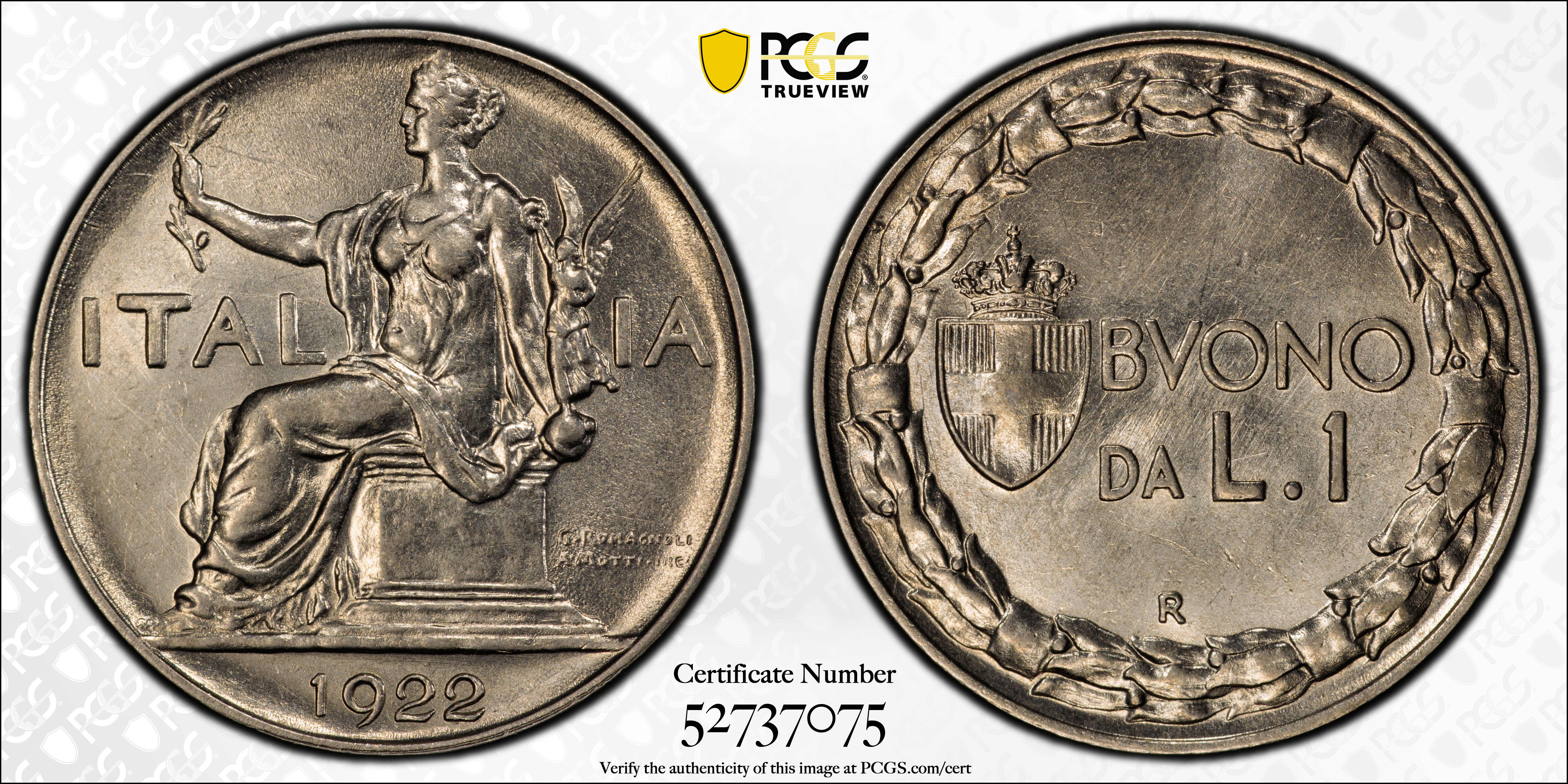 1922-R Lira AU58 认证号52737075, PCGS号398760