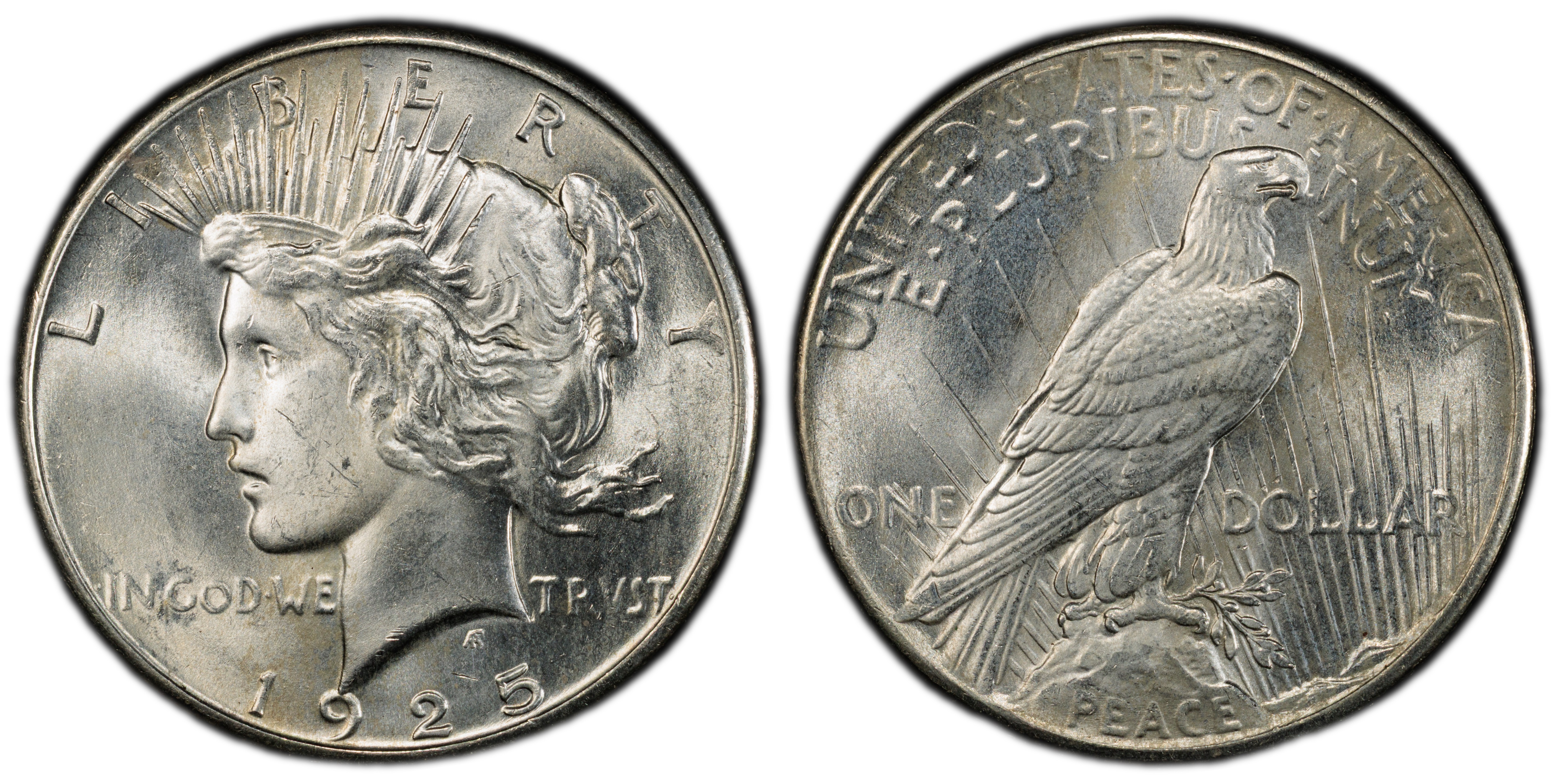 This and the 1922, 1923, and 1924 Philadelphia Mint issues constitute the four most common Philadelphia Mint Peace silver dollars. In high Mint State grades the 1925 is the most plentiful Peace dollar.