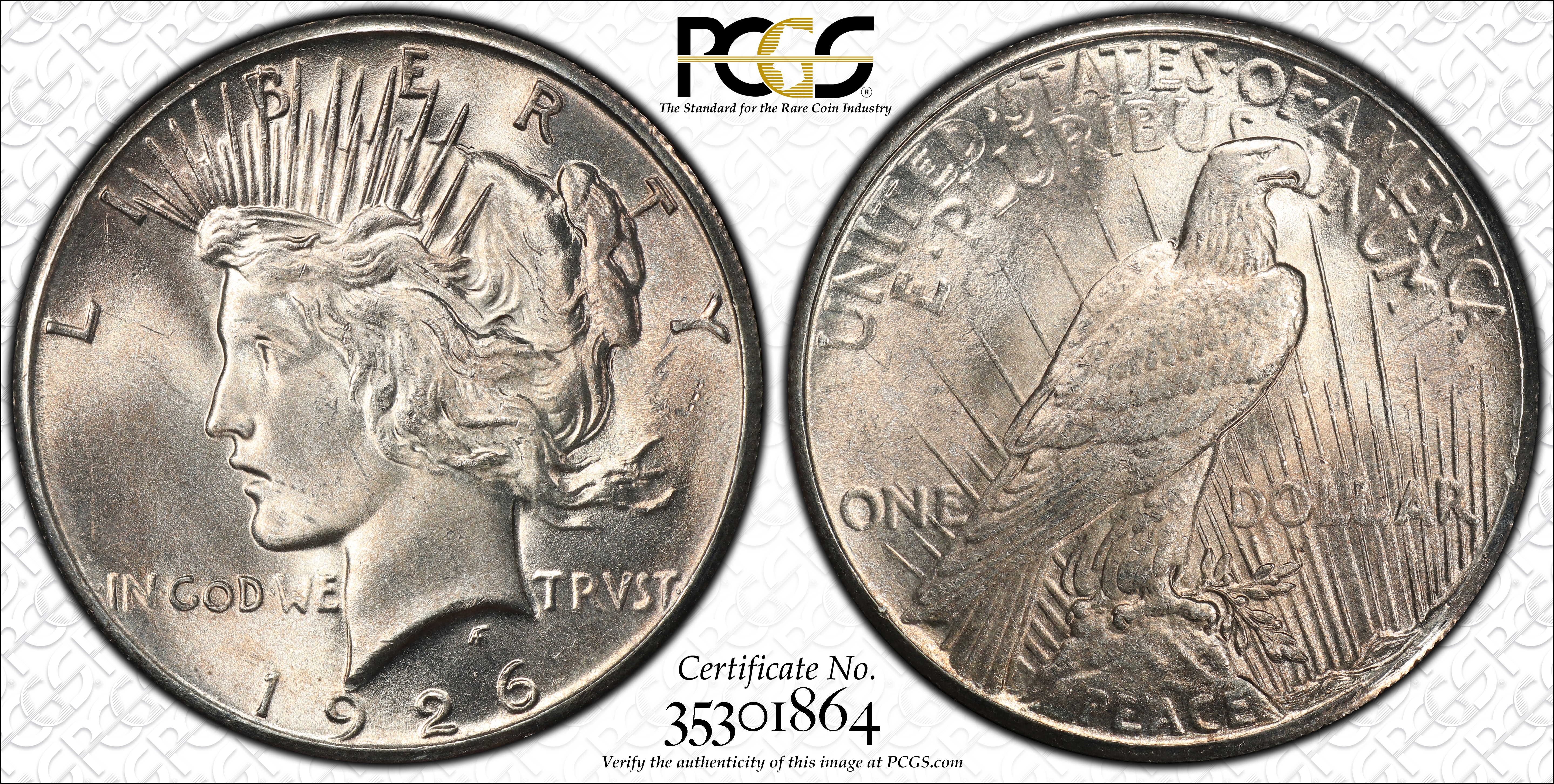 In 1926, the output of Silver Dollars at the Philadelphia mint dropped to less than a fifth of the previous year. For that reason alone, some collectors think the 1926 is scarce or worth a premium. In general it is not. Certainly, the population of certified Mint State examples is lower than in 1925, but not to the point where collectors are unable to find nice examples. In fact, thousand of MS-63 and MS-64 examples have been certified by PCGS and even in MS-65, this date is readiuly available. However, in MS-66, the population drops off dramatically and absolutely none have been graded finer by PCGS. Although strike varies, this date can be found with full details and a strong strike. Luster ranges from frosty to brilliant. Collectors seeking quality 1926 Peace Dollars should have no trouble finding nice-looking, well struck examples with a minimum of marks. Anything less should be avoided or discounted.