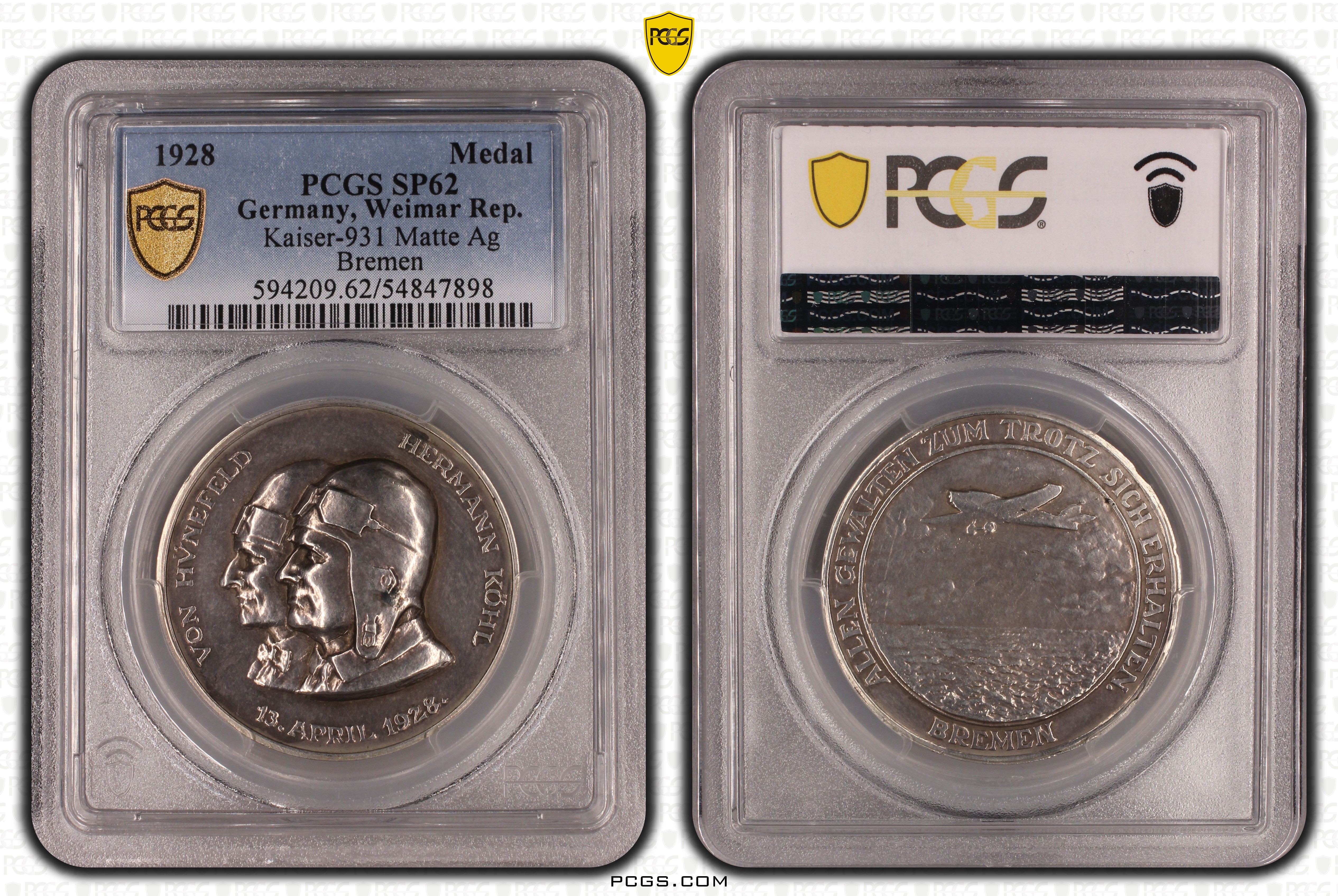 1928 Medal Kaiser-931 Matte Ag Bremen SP62 认证号54847898, PCGS号594209