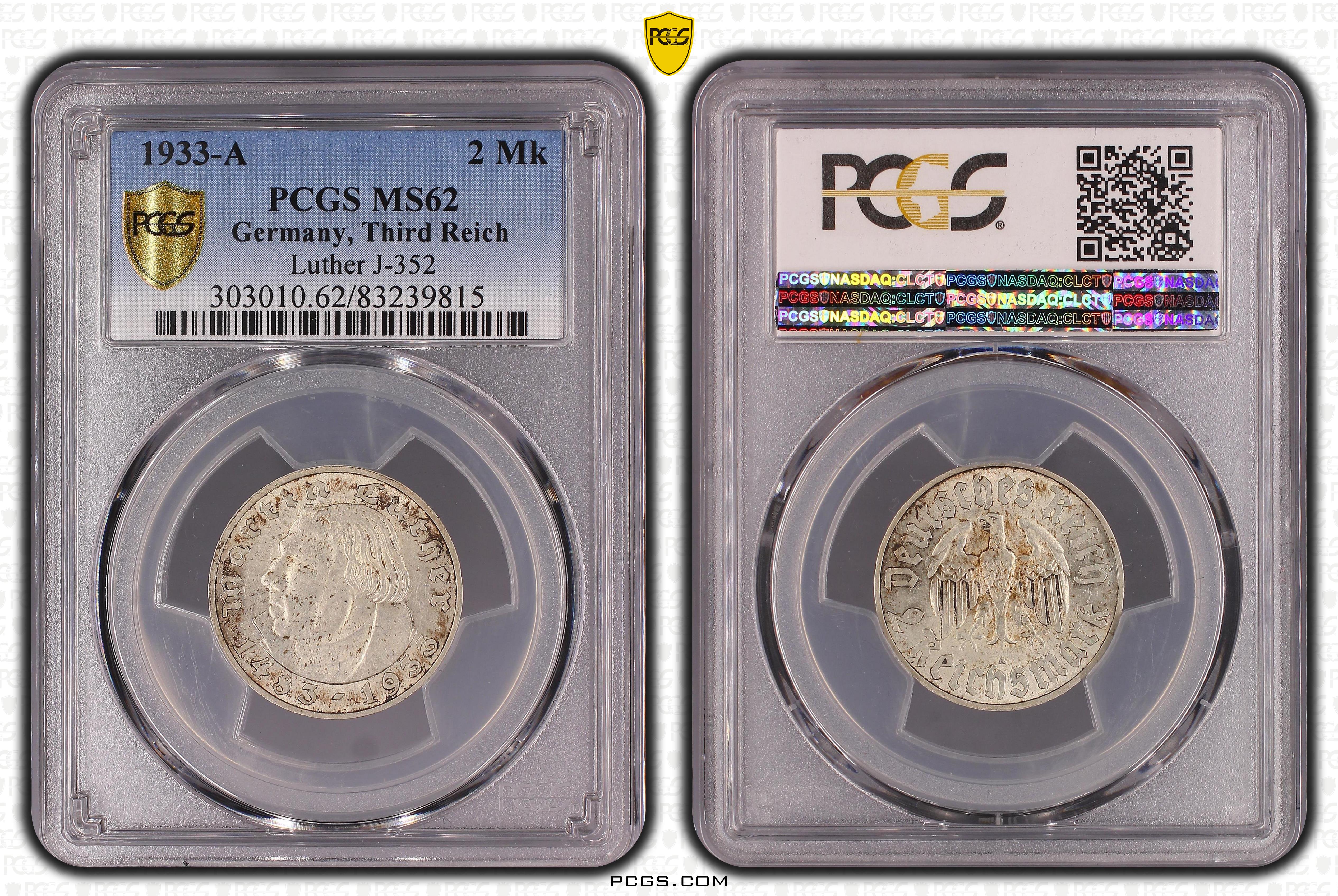 1933-A 2 Mk Luther J-352 MS62 认证号83239815, PCGS号303010