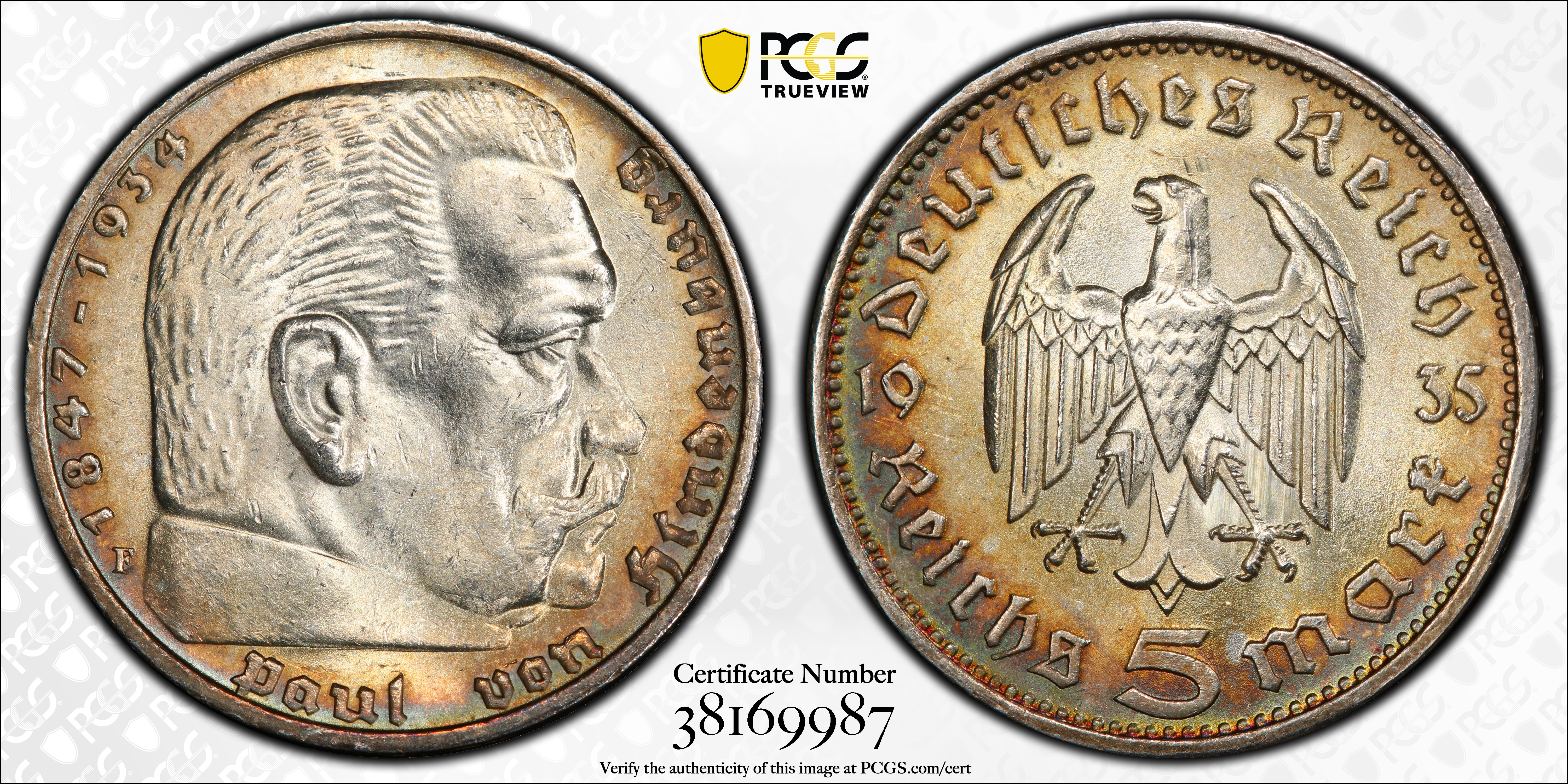 1935-F 5 Mk Hindenburg J-360 MS62 认证号38169987, PCGS号303186