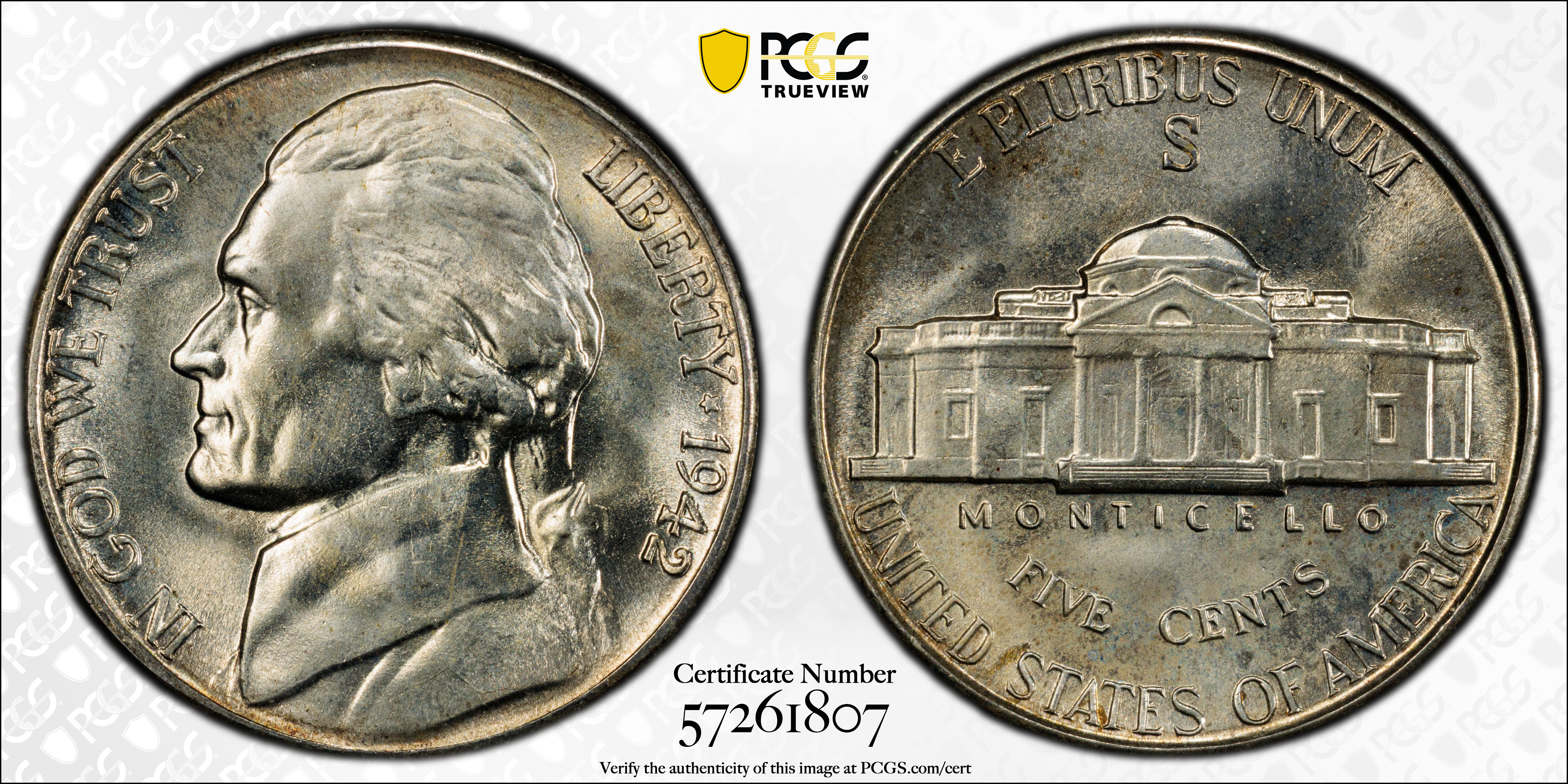 1942-S 5C MS67 认证号57261807, PCGS号4017