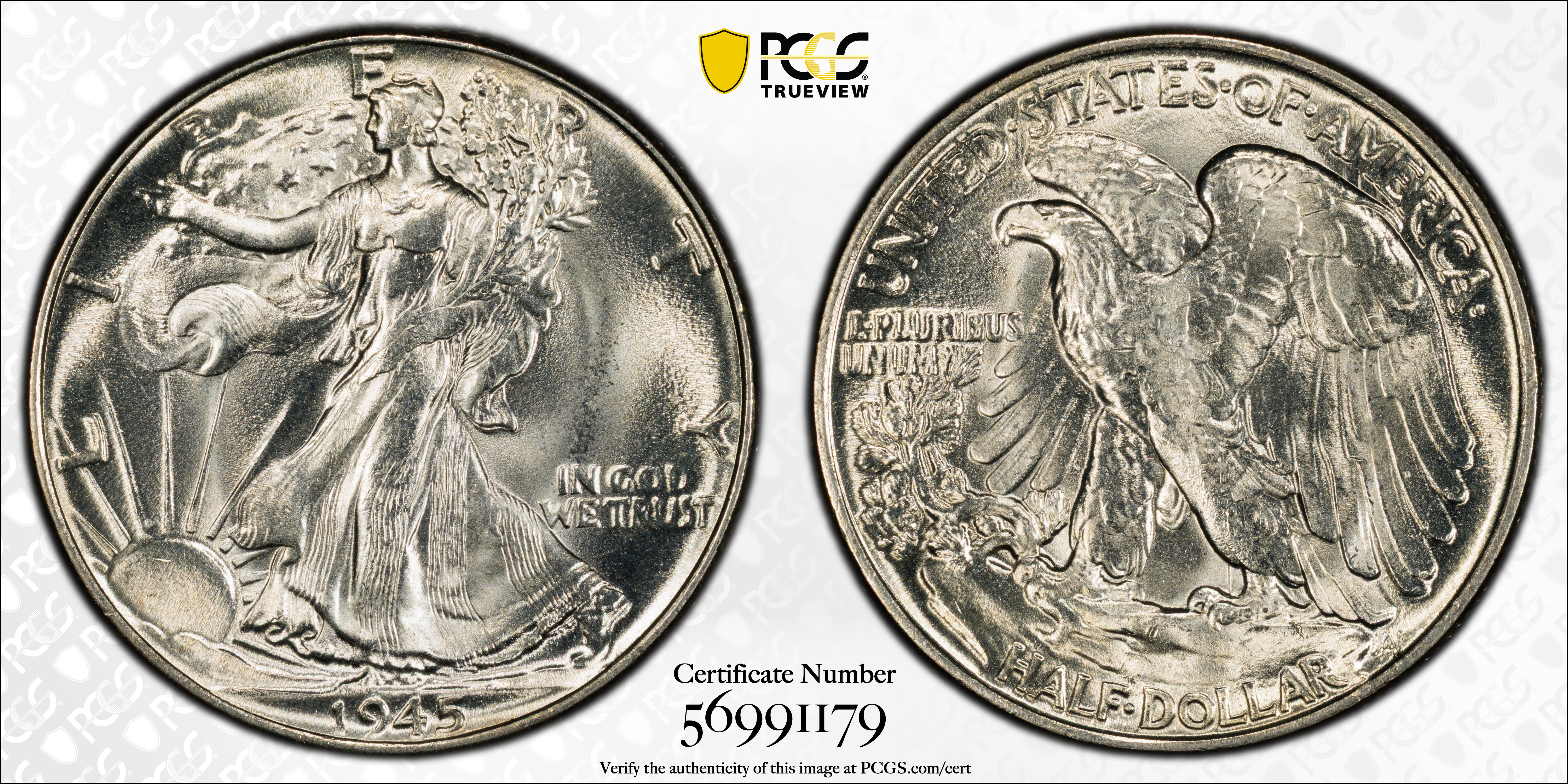 The 1945 Philadelphia is one of the most common dates in the Walking Liberty half dollar series in all grades except MS67 and MS68. This issue was saved and it comes nice. Strike is not a problem and many very frosty white Gems exist.