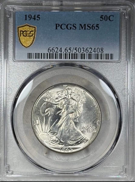 The 1945 Philadelphia is one of the most common dates in the Walking Liberty half dollar series in all grades except MS67 and MS68. This issue was saved and it comes nice. Strike is not a problem and many very frosty white Gems exist.
