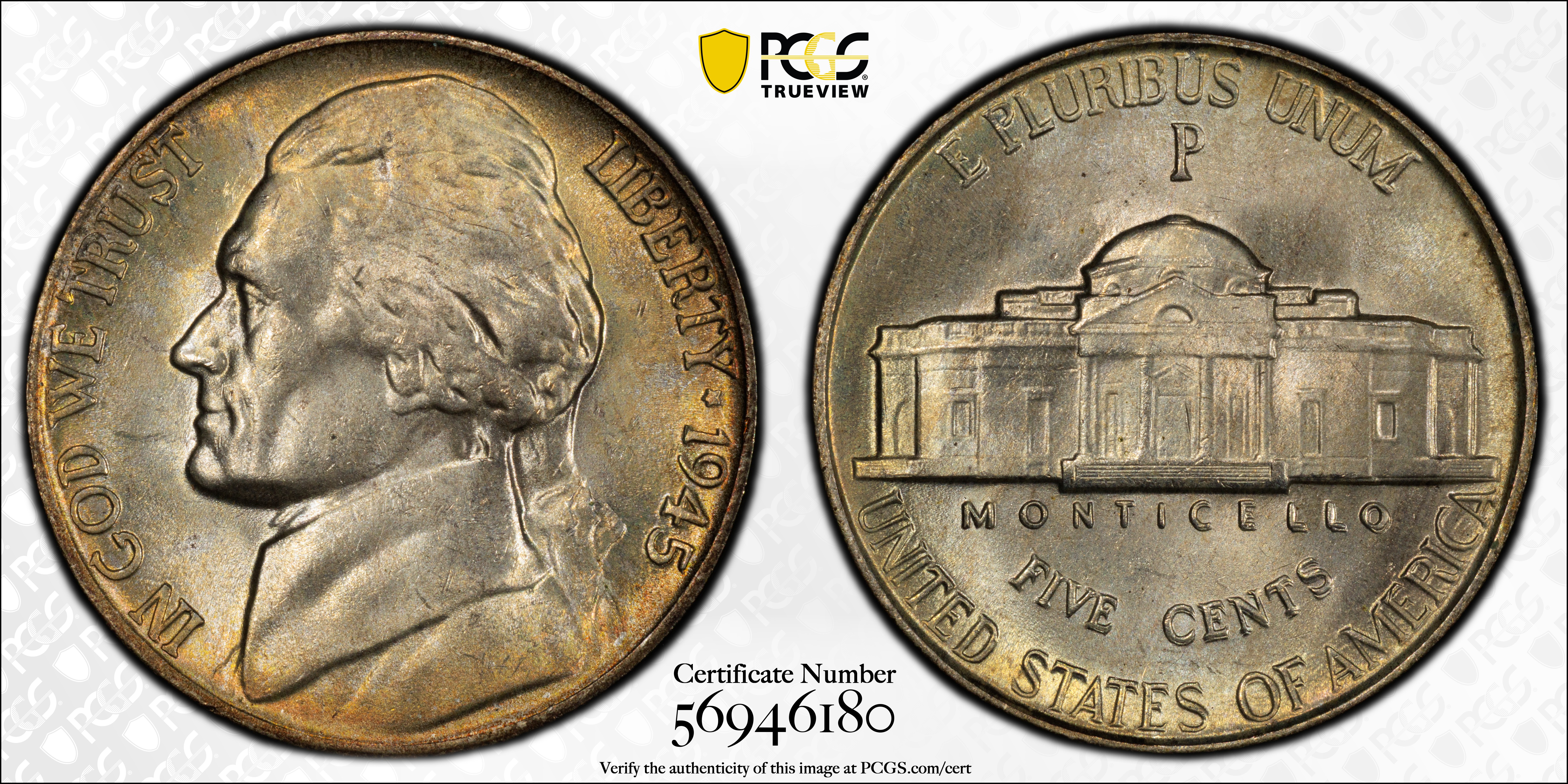 1945-P 5C Doubled Die Reverse MS66 认证号56946180, PCGS号4173