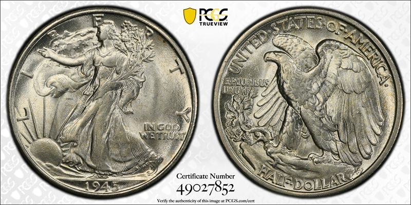 The 1945-S is the second most common San Francisco Mint Walker, after the 1946-S. While the strike is not usually as sharp as you will see on the Philadelphia and Denver Mint coins, the strike on the typical 1945-S is much stronger than is found on the 1940 thru 1944 San Francisco issues. The 1945-S can be found either toned or with frosty luster, though the luster tends to be a little more satiny than on the D-Mints.