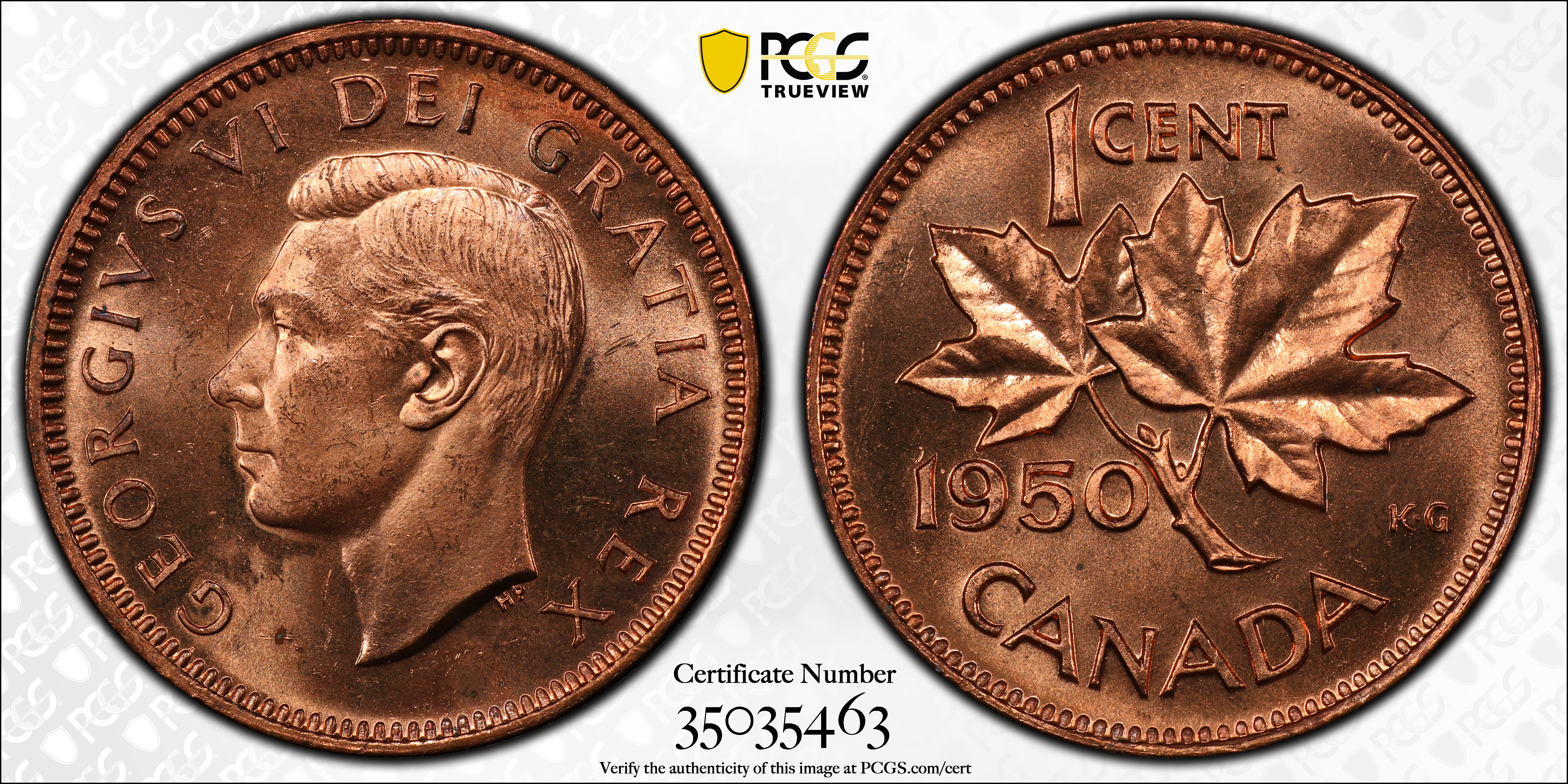 1950 1C, RD MS65RD 认证号35035463, PCGS号30386
