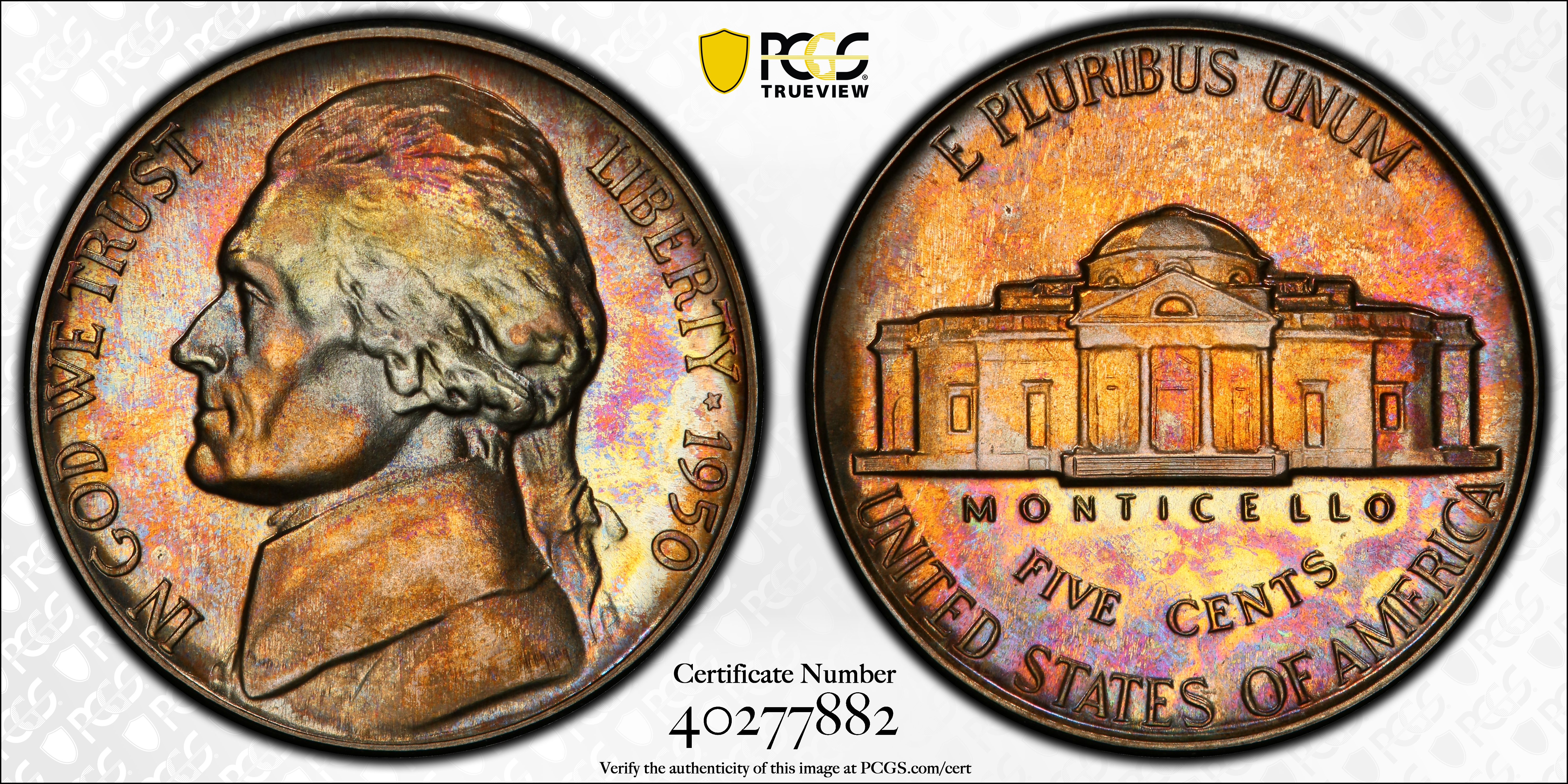 Brilliant Proof 1950 Nickels are quite common, but Cameo examples become scarce and Deep Cameo Proofs are downright rare. The highest grades awarded by PCGS (as of July 2011) include the following: 18 in PR-68, 36 in PR-67CAM, and 8 in PR67DCAM.