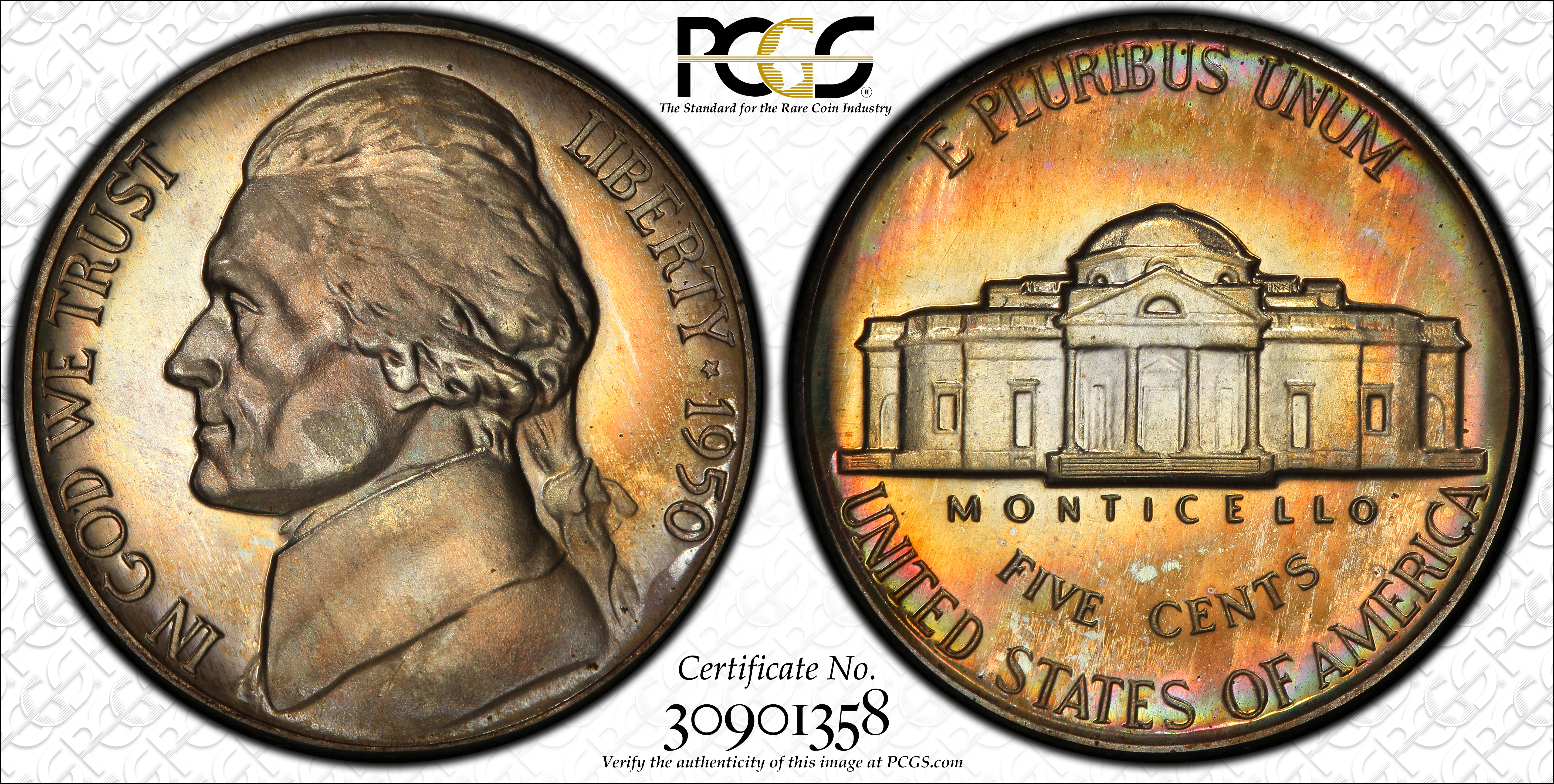 Brilliant Proof 1950 Nickels are quite common, but Cameo examples become scarce and Deep Cameo Proofs are downright rare. The highest grades awarded by PCGS (as of July 2011) include the following: 18 in PR-68, 36 in PR-67CAM, and 8 in PR67DCAM.
