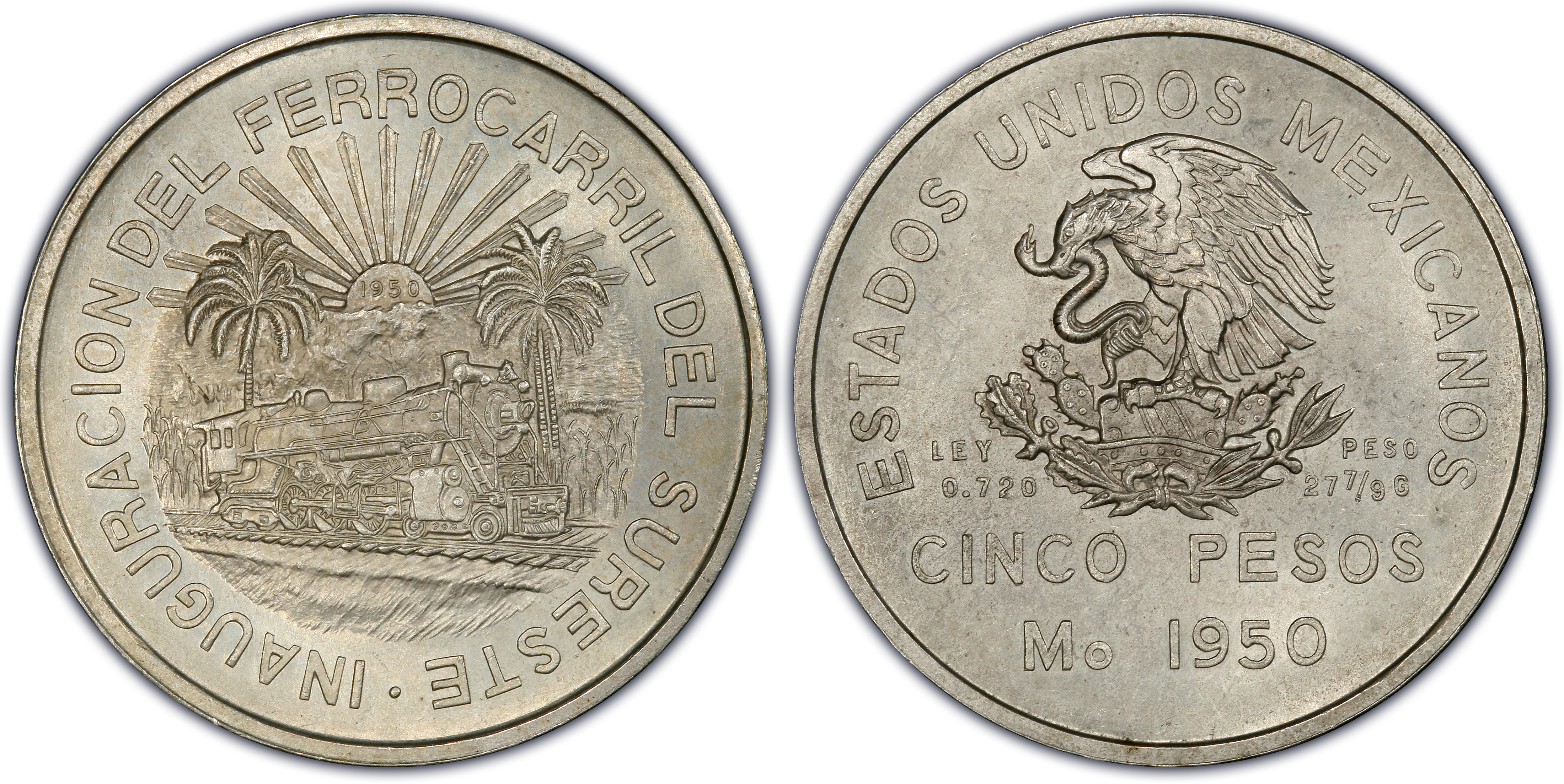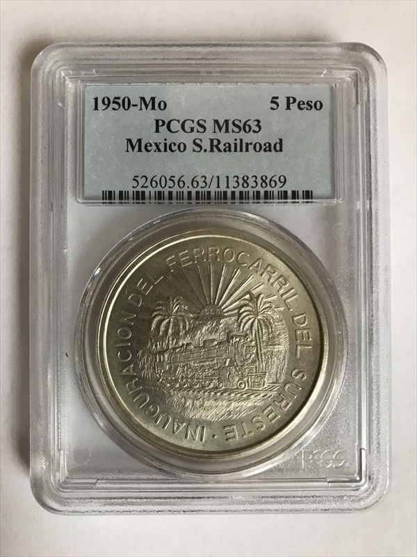 1950-Mo 5 Peso Southeastern Railroad KM-466 Ag MS63 认证号11383869, PCGS号526056