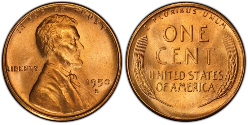 1950-S 1C, RD MS65RD 认证号56086600, PCGS号2785
