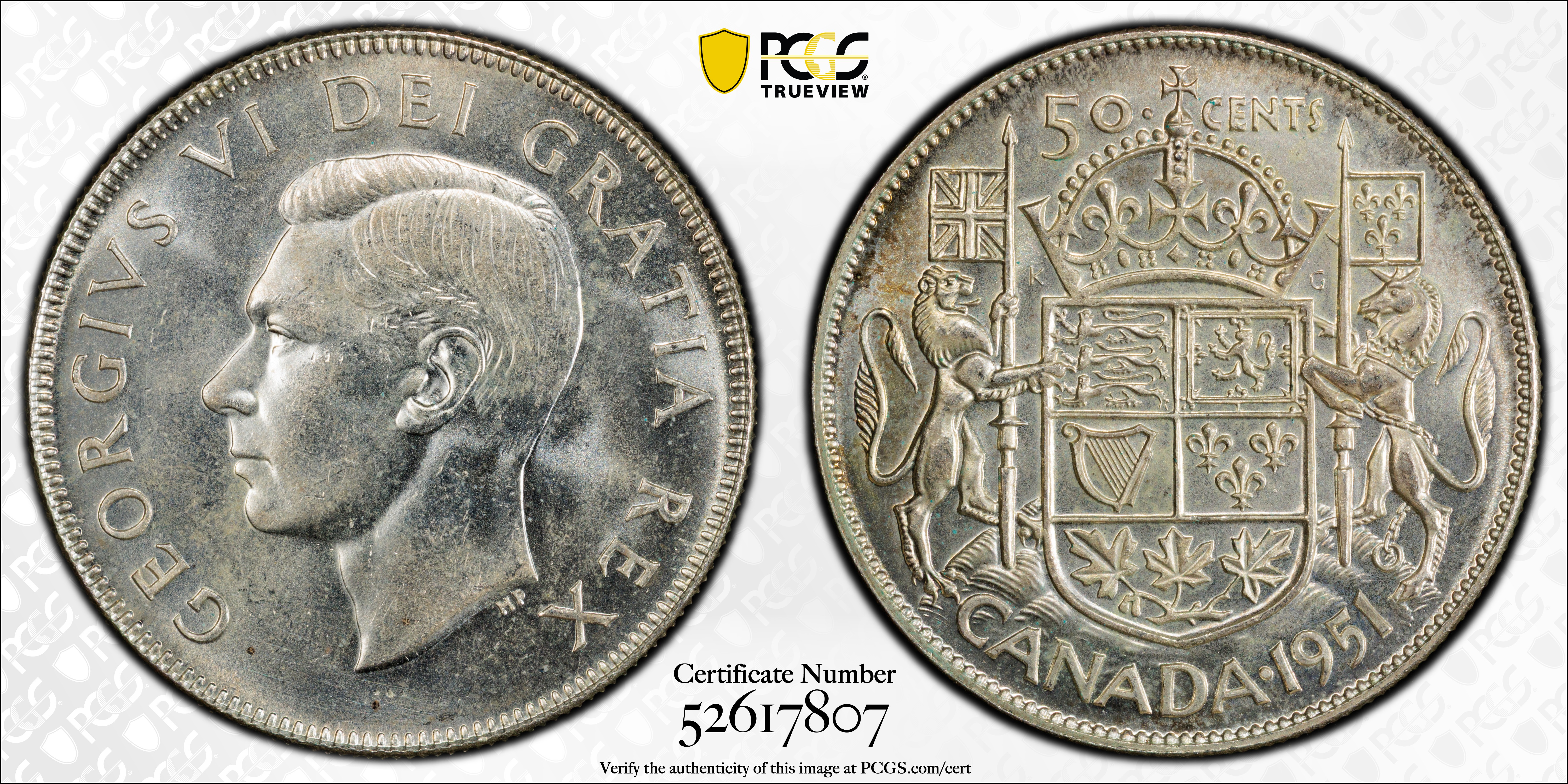 1951 50C Narrow Date MS65 认证号52617807, PCGS号972741