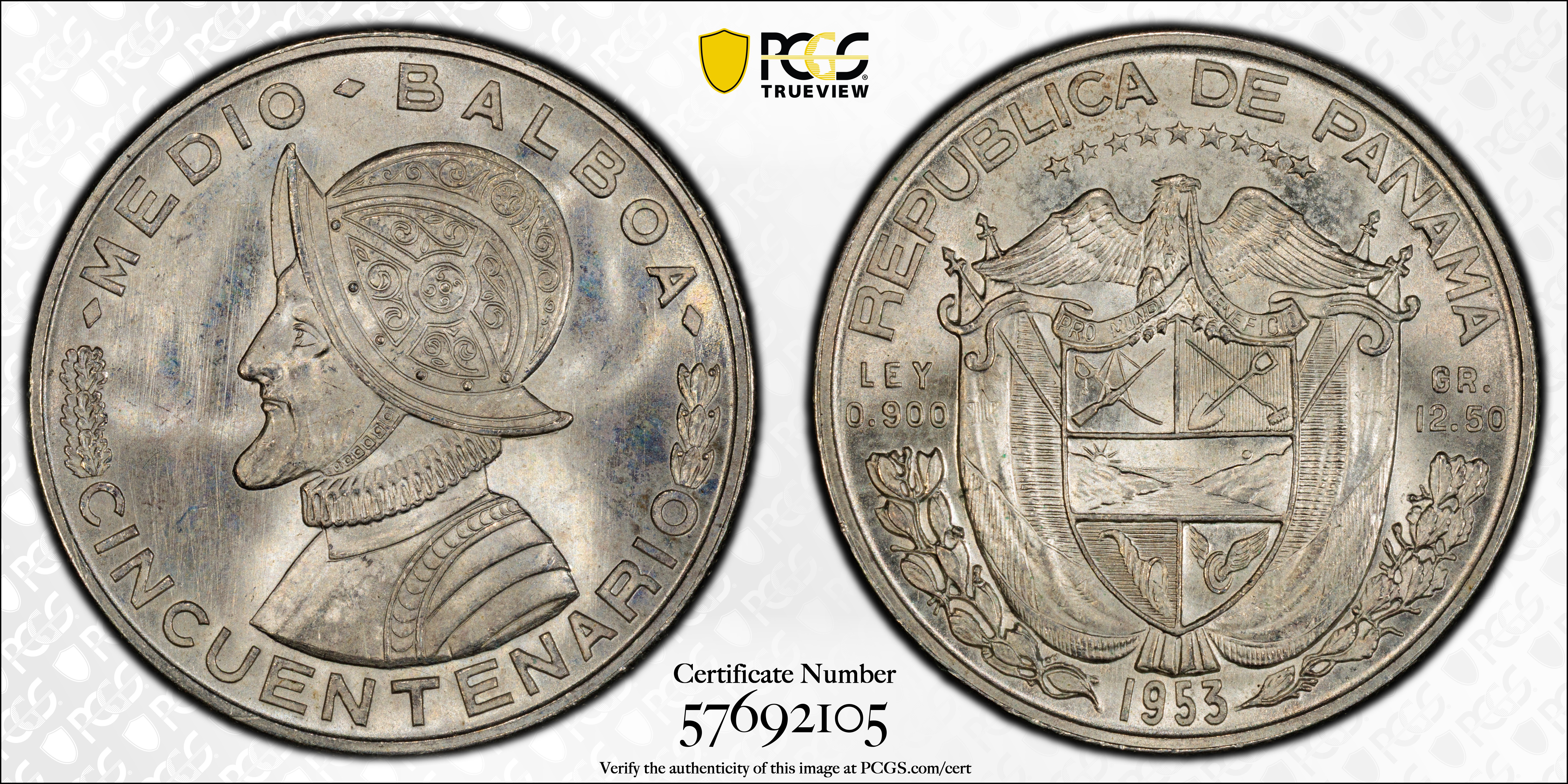 1953 1/2 B 50th Ann. Rep. of Panama KM-20 Ag MS66 认证号57692105, PCGS号173803