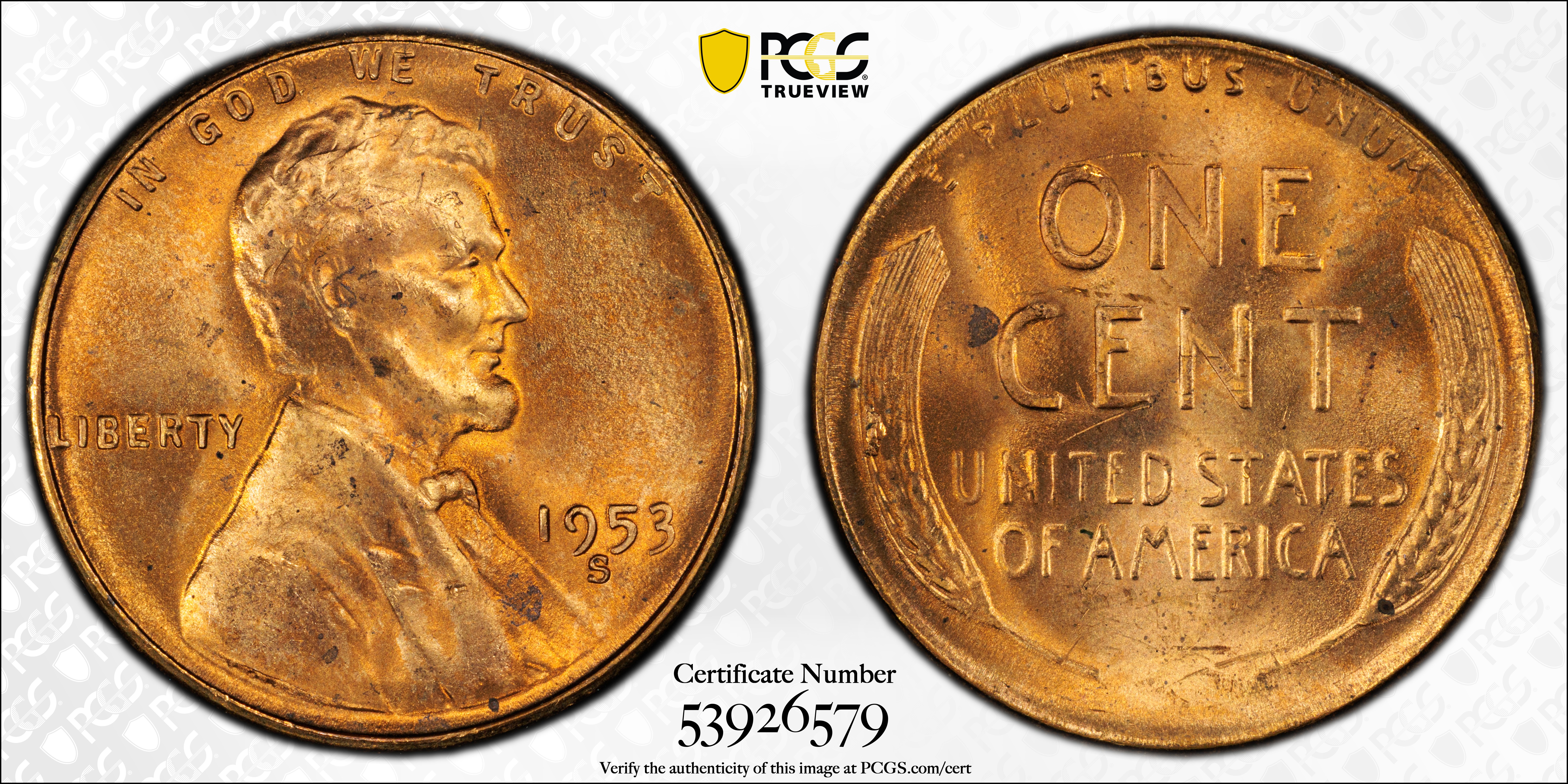 1953-S 1C, RD MS65RD 认证号53926579, PCGS号2812