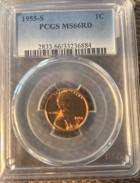 1955-S 1C, RD MS66RD 认证号33236884, PCGS号2833